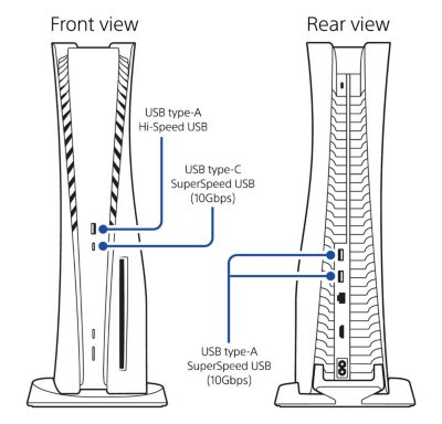- PlayStation 5 (оригінальна): Один USB-C і один USB-A спереду / Два USB-A ззаду