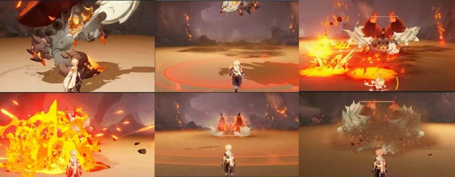 Volcano eruption: стріляє незліченною кількістю вогняних куль зі своїх рогів, кожна з яких завдає 50% ATK як AoE Pyro DMG після приземлення та залишає вражену землю спаленою. Випалена земля наносить гравцям, які стоять на ній, 6% ATK у вигляді DMG піро кожні 0,5 секунди. Ця атака використовується лише тоді, коли розплавлені роги неушкоджені. Цей набір рухів складний у часі, оскільки вогняні кулі стріляють у випадкових місцях, а також залишають землю Pyro DMG пізніше. Найкраще уникати таких ATK і триматися на відстані, коли Бос виконує таку атаку.