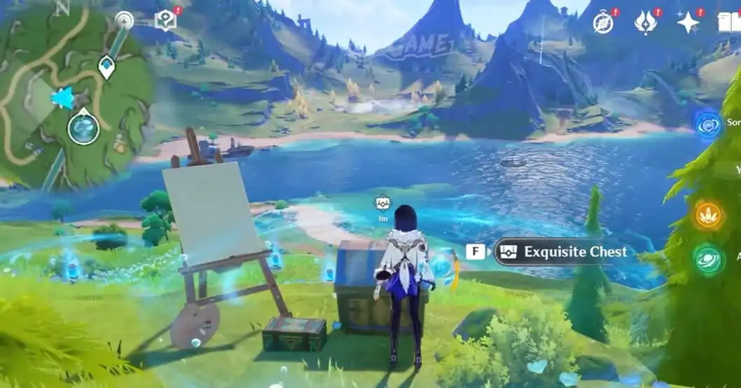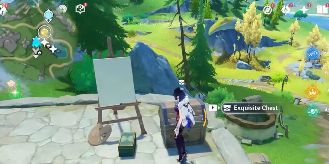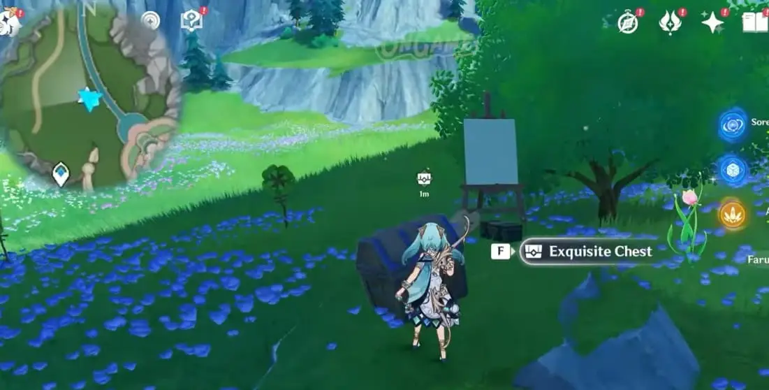 Перейдіть до Мітки на середині регіону Берил (з північного заходу від Статуї Семи), а потім злетіть на захід до дороги або візьміть Мітку трохи на південь і рушайте на північ, щоб знайти наступне полотно Сальси. Перемістіть два Кришталі обнаруження об'єму води в середину, а потім активуйте їх, використовуючи Дивовижну Гідрограну. Відкрийте Скриньку Genshin Impact Exquisite, щоб викликати Сальсу. Далі пересуньте Механізм посередині дороги на бік.