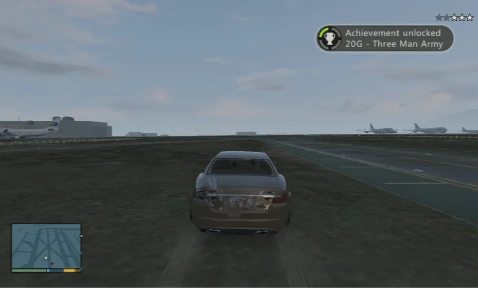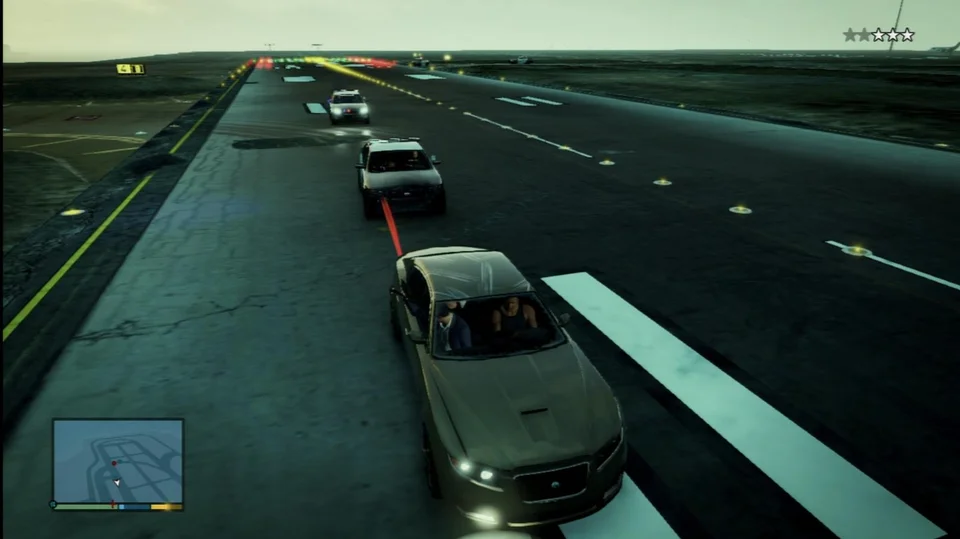 Поїдьте в аеропорт Лос-Сантос і зайдіть через головні ворота ангару. Витягніть машину на аеродром. Це автоматично активує тризірковий рівень розшуку. Тепер просто три хвилини кружляйте навколо аеродрому. Якщо поліція втратить ваш слід, проїдьте в її поле зору, щоб зберегти статус розшуку.