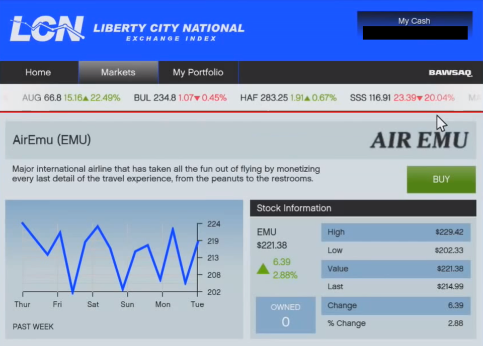 Перейдіть на ринок LCN як будь-який персонаж, який має щонайменше 21 мільйон доларів, і перевірте ринки. Опинившись там, дійсно неважливо, що ви купуєте, лише якщо ви купуєте максимальну суму, яку можете (я зробив це з AuguryInsurance (AUG)). Після завершення транзакції продайте все, що щойно купили, і у вас залишиться та сама сума готівки, з якої ви почали. Промийте, вимийте та повторюйте, доки трофей/досягнення не розблокується.