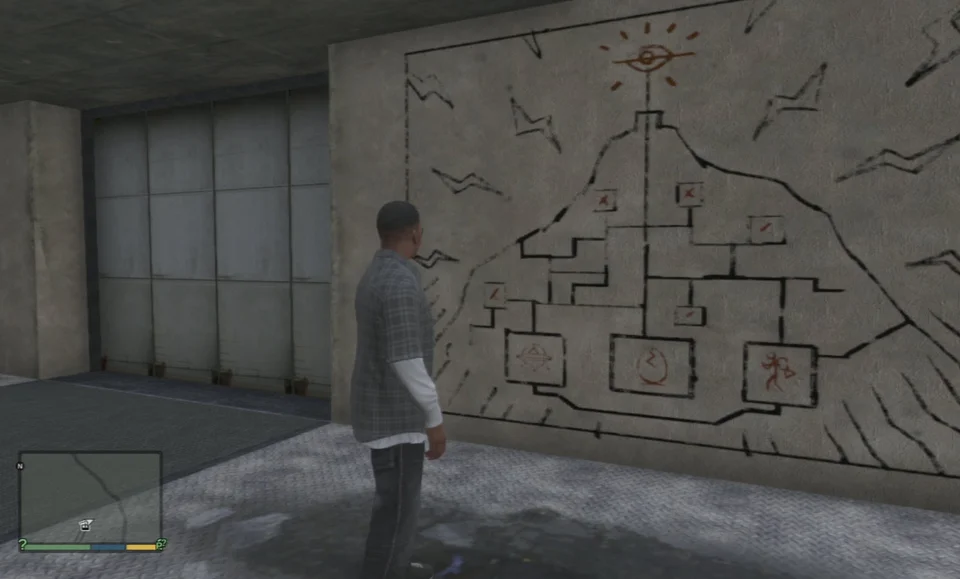 Загадковий малюнок на стіні станції канатної дороги на вершині гори Чіліад був одним із перших джерел інтриг для мисливців за змовами GTA.Основна карта надзвичайно схожа на розташування шахти та камери піраміди, що свідчить про можливе існування підземне підземелля. Навколо зображення також розкидано кілька менших маркерів. Хоча значення багатьох символів усередині зашифровано, великі значки розбитого яйця, космічного корабля та гуманоїдної форми залишаються інтригуючою загадкою.
