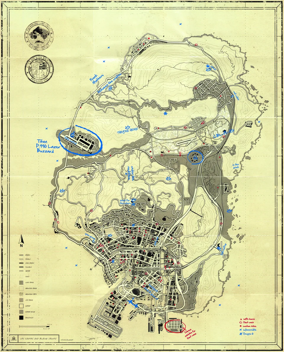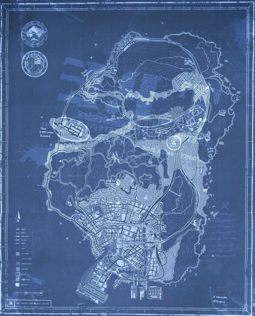На карті показано місця, де можна швидко отримати готівку, сейфи, спеціальні атракціони, броньовані автомобілі та бочки з ядерними відходами в океані, для вилучення яких потрібен підводний апарат. Карта також наповнена купою прихованих повідомлень і символів, видимих лише на Оригінальній карті Blueprint з ультрафіолетовим світлом.