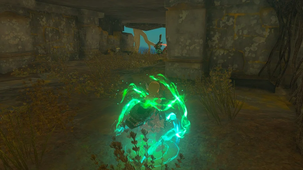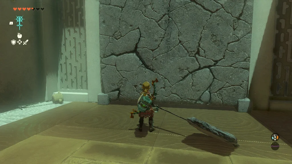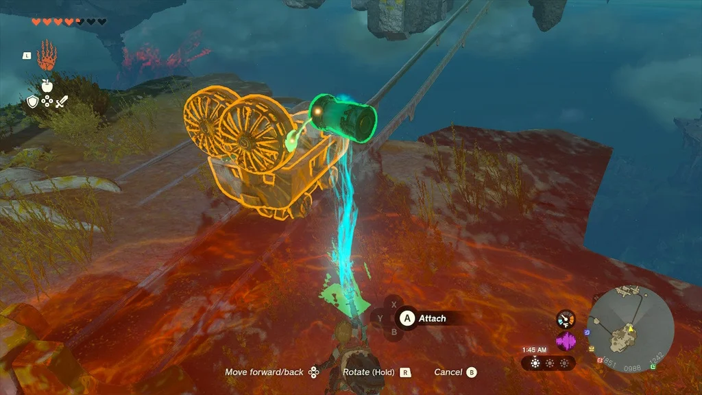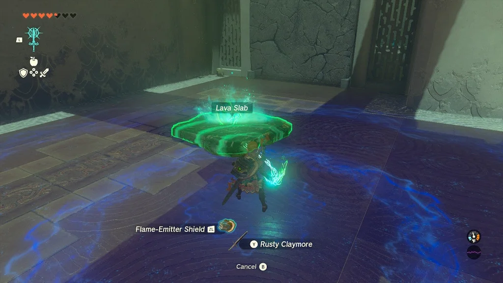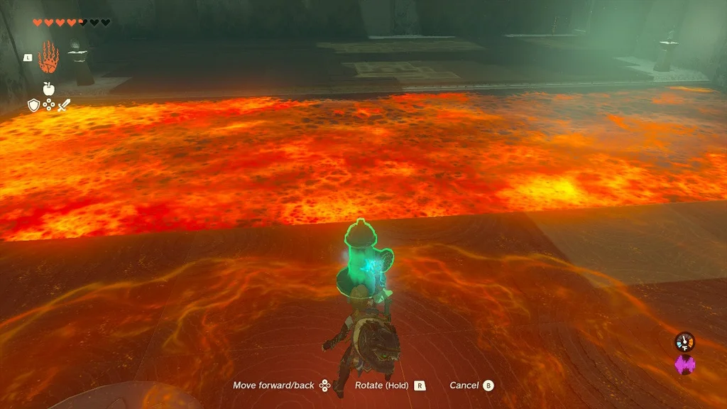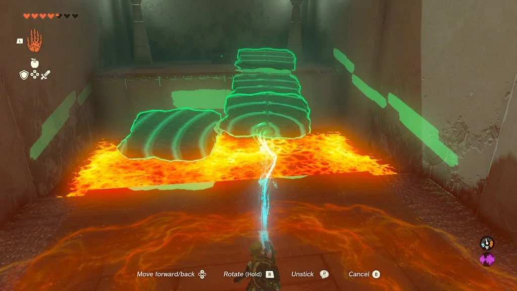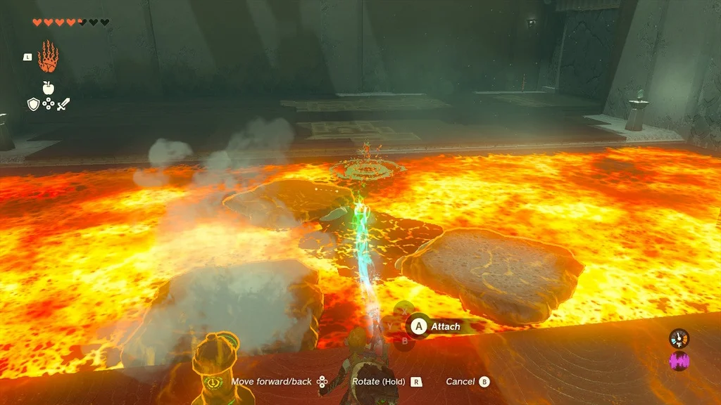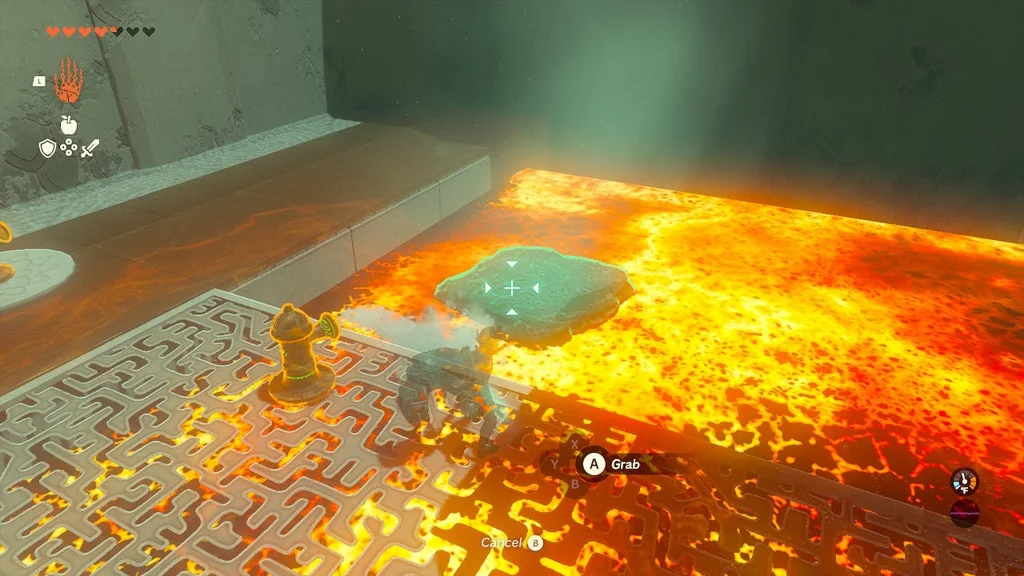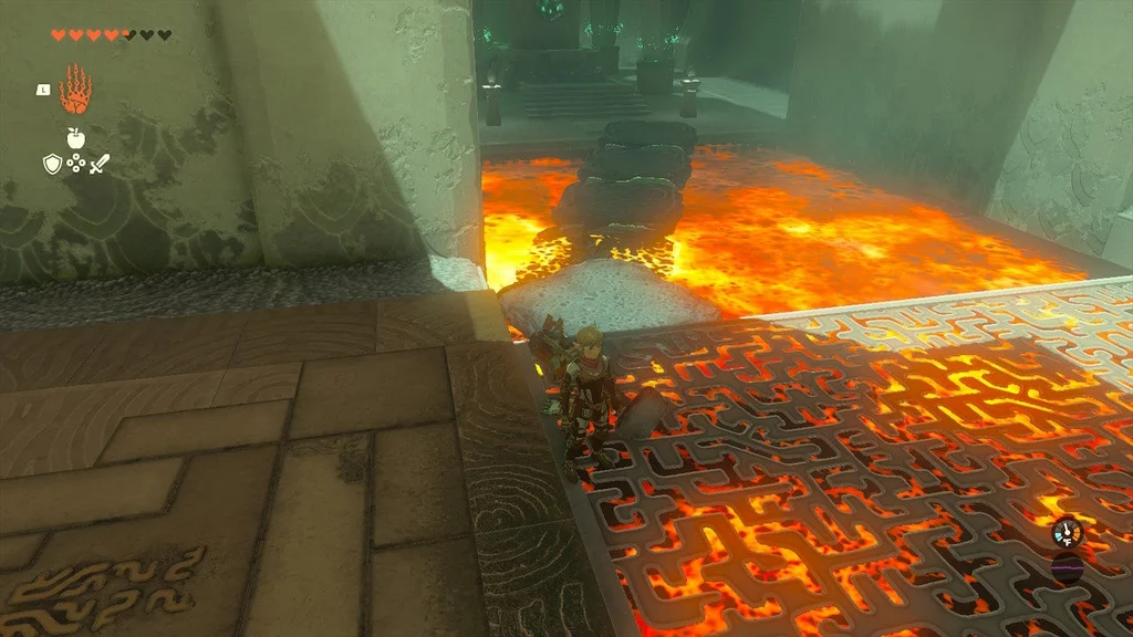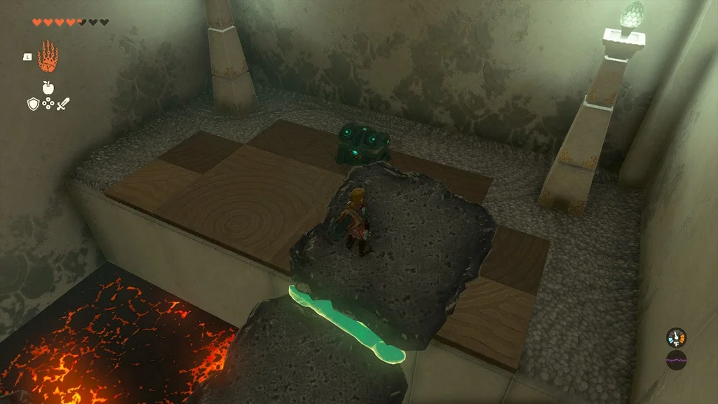 На початку цього храму ви знайдете кран, який можна взяти за допомогою Ultrahand і поставити, з якого б’є вода. Помістіть його біля лави та вдарте по ньому. Він увімкнеться і розбризкує воду в лаву.