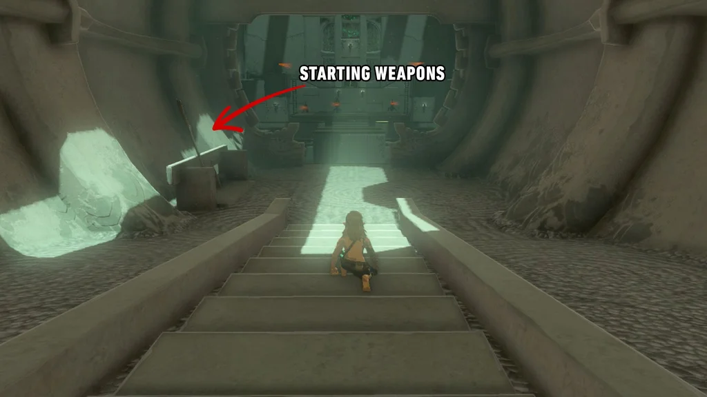 Опинившись у святині, ви втратите доступ до всього свого спорядження, оскільки це святилище Proving Grounds, тобто вам доведеться битися з тим, що валяється навколо, або захопити те, що залишилося від убитих ворогів. Коли ви дійдете до кінця першого коридору, ви побачите довгу палицю та дерев’яну палицю, що лежать на полиці ліворуч від вас. Це небагато, але це те, що ми маємо наразі.