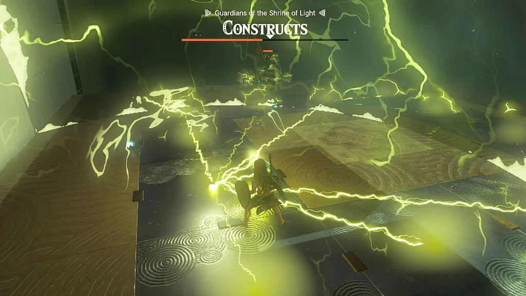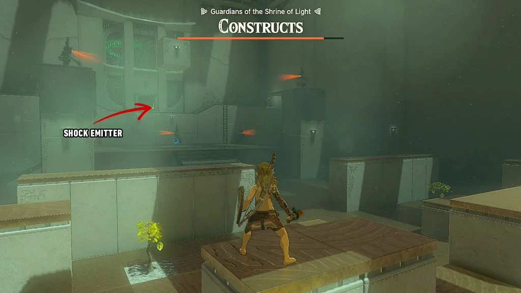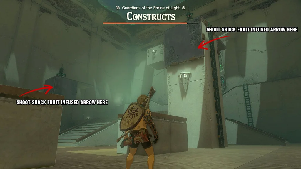 Проходячи повз лабіринт, ви побачите дві споруди дальнього бою на двох стовпах. Ви помітите, що вони насправді сидять на вершині стовпа з металевими панелями вгорі. Наведіть свій лук на кубики та з’єднайте свою стрілу з ударним фруктом. Це спричинить електризацію куба, вбивши конструкцію над ним. Зробіть це для обох конструкцій.