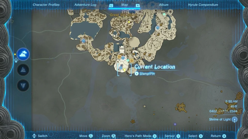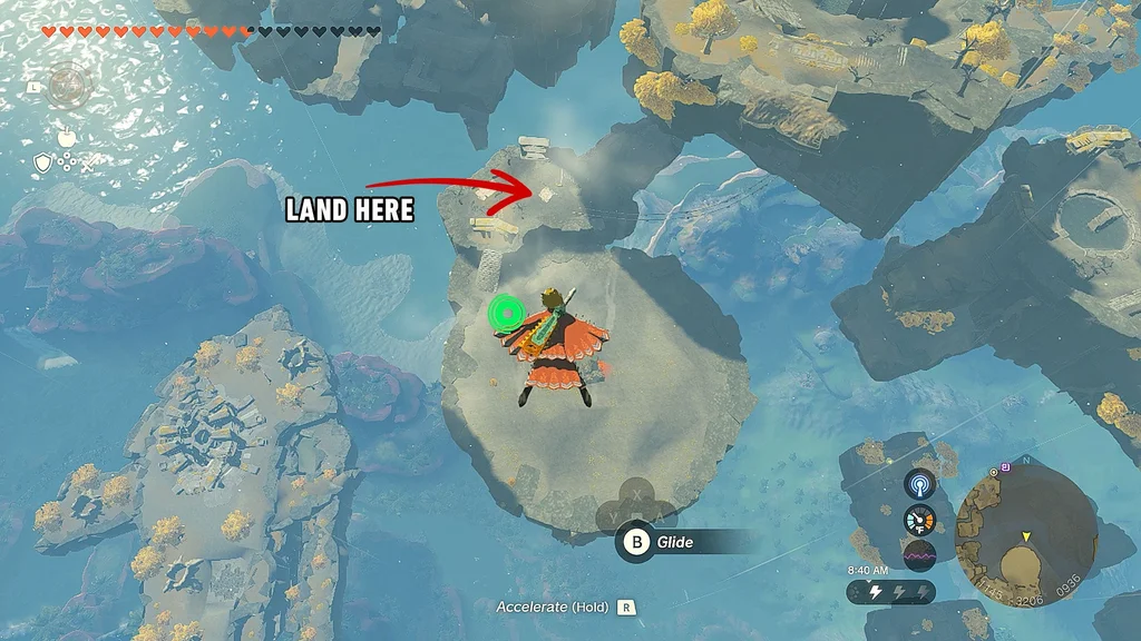 По-перше, ви захочете телепортуватися до храму Начоя, який був одним із перших храмів, які ви завершили на острові Великого неба. Опинившись там, залиште будівлю Храму, підніміться на вершину та вирушайте до південної частини острова Великого Неба.