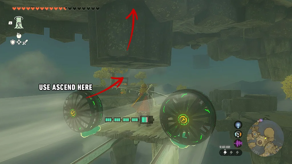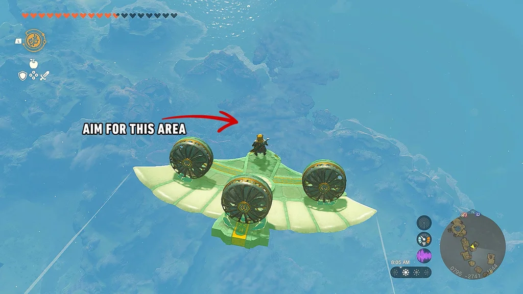 Опинившись там, вам потрібно буде зробити кілька речей. По-перше, зніміть усе своє металеве спорядження, оскільки на островах Thunderhead все ще буде шторм і вас вразить блискавка, якщо ви одягнете щось електропровідне. Далі ви можете стрибнути з південної частини острова та почати літати на параплані в напрямку до острова Громової голови, використовуючи здатність Мудреця вітру Туліна, щоб поштовхнути вас до острова. Одягнувши набір обладунків Glider, ви легко потрапите туди, оскільки острів Thunderhead розташований набагато нижче островів Great Sky. Ще один спосіб швидше дістатися до острова – це побудувати крило з кількома вентиляторами, щоб перелетіти на острів. Крило зникне відразу, коли ви будете над островом. У будь-якому випадку ви прагнете приземлитися в дуже конкретному місці.