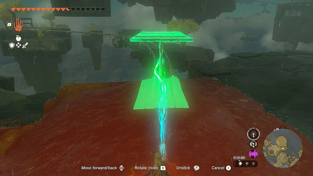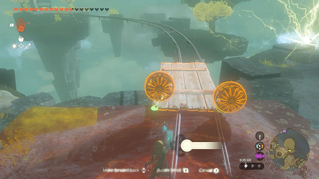 Опинившись там, ви побачите перила, але не візок! Натомість ви захочете використати готові дошки, які вже є в грі. Візьміть дошку за допомогою Ultrahand і розташуйте її таким чином, щоб нижня частина поміщалася між рейками, щоб вона слідувала за рейками й не впала – майже як кермо.