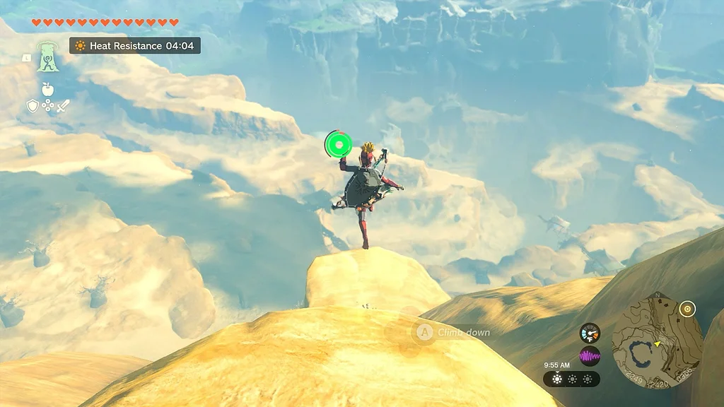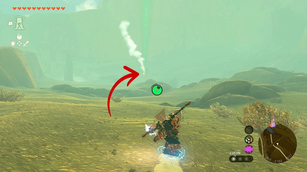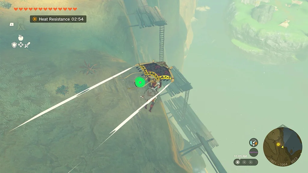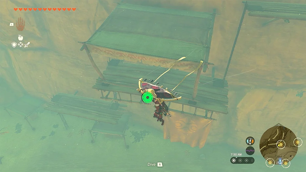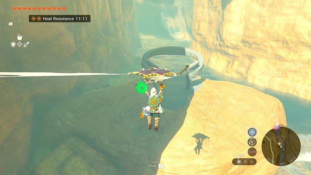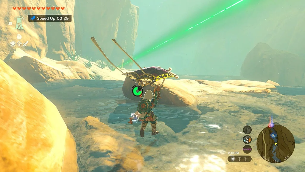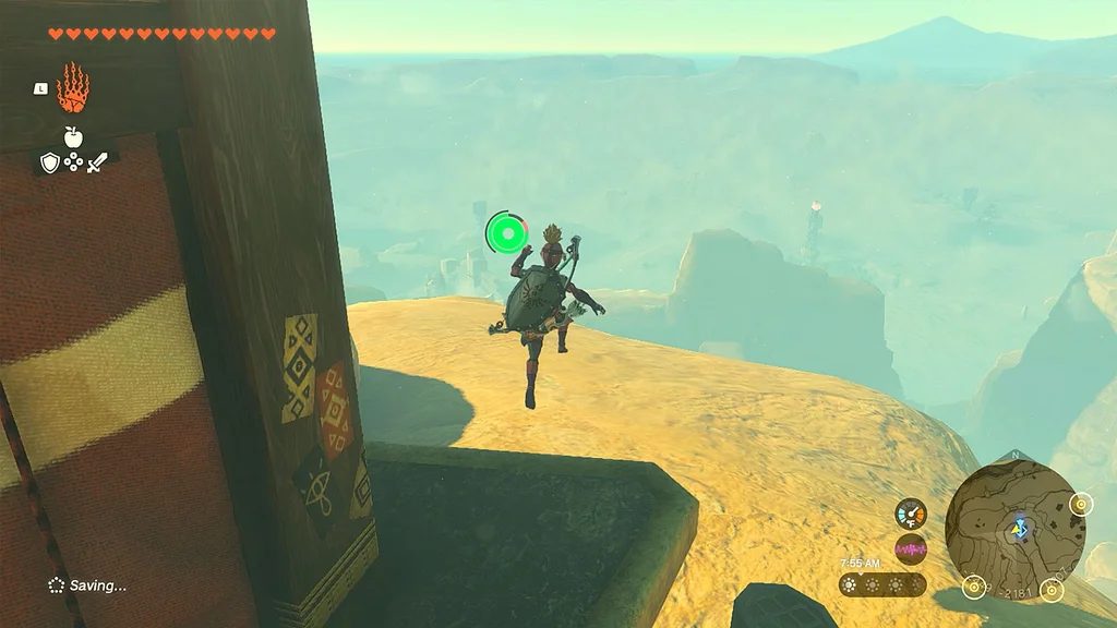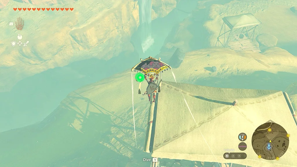 Щоб отримати другу, швидко подорожуйте до сусідньої башти Gerudo Canyon Skyview Tower (ви будете робити це кілька разів протягом цього квесту). Опинившись там, біжіть прямо на північ до наступної жовтої точки на міні-карті. Знову зістрибніть з уступу та почніть літати на параплані, доки маркер вашого гравця не опиниться над крапкою, а потім почніть скидати, час від часу витягаючи свій параплан для наведення.