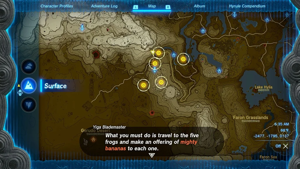 Увійшовши всередину, біжіть прямо по коридору та поговоріть з Yiga Blademaster. Він дасть вам іспит Side Adventure The Yiga Clan Exam, який просить вас покласти п’ять могутніх бананів як пропозицію п’яти різним статуям жаби поблизу. Він навіть покаже вам на карті, де саме знаходиться кожен із них.