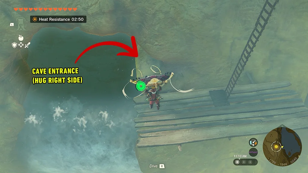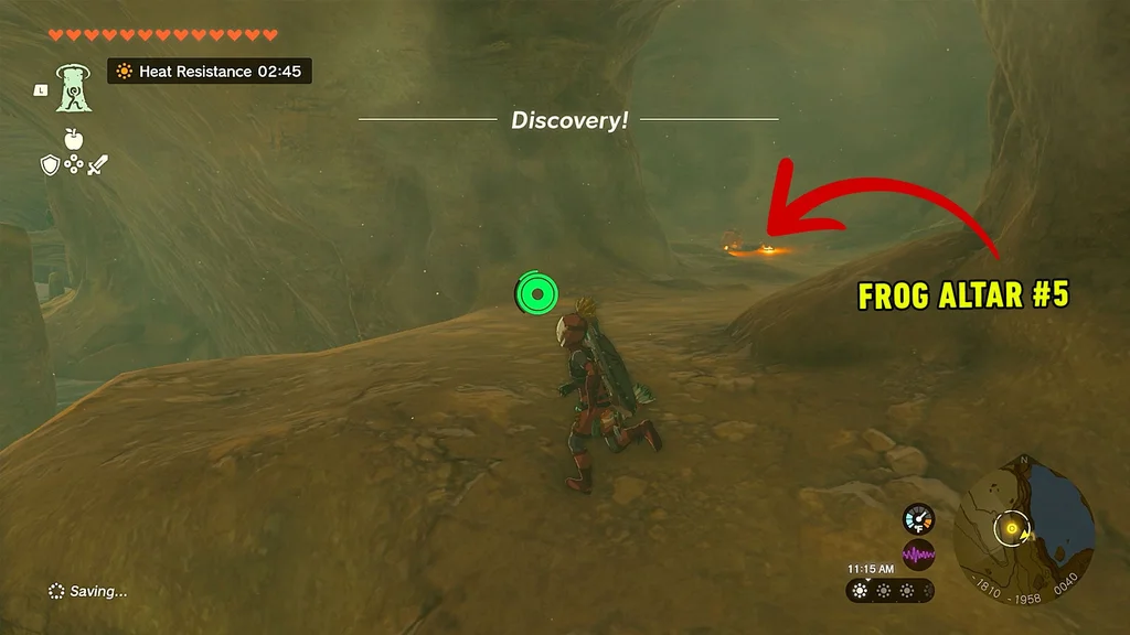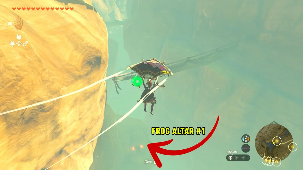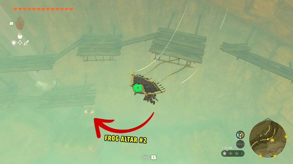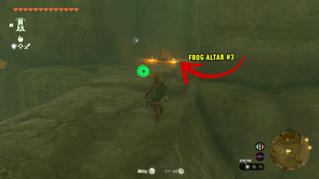 Стоячи на маркері на карті, вам потрібно буде трохи піти на схід, стрибнути зі скелі та політати на параплані, щоб знайти печеру, у якій знаходиться жаб’ячий вівтар. Ви побачите кілька дерев’яних містків – приземліться на один із них і почніть спускатися до печери, яка знаходиться на вершині водоспаду.