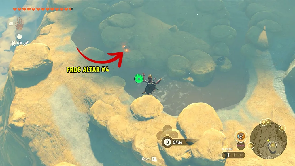 Тепер, коли у вас залишився лише один маркер на карті, ви просто біжите до нього з жаб’ячого вівтаря №4. Почніть бігти на північ/північний схід до маркера, а коли у вас закінчиться земля, стрибніть і активуйте свій параплан, щоб почати пливти до маркера.
