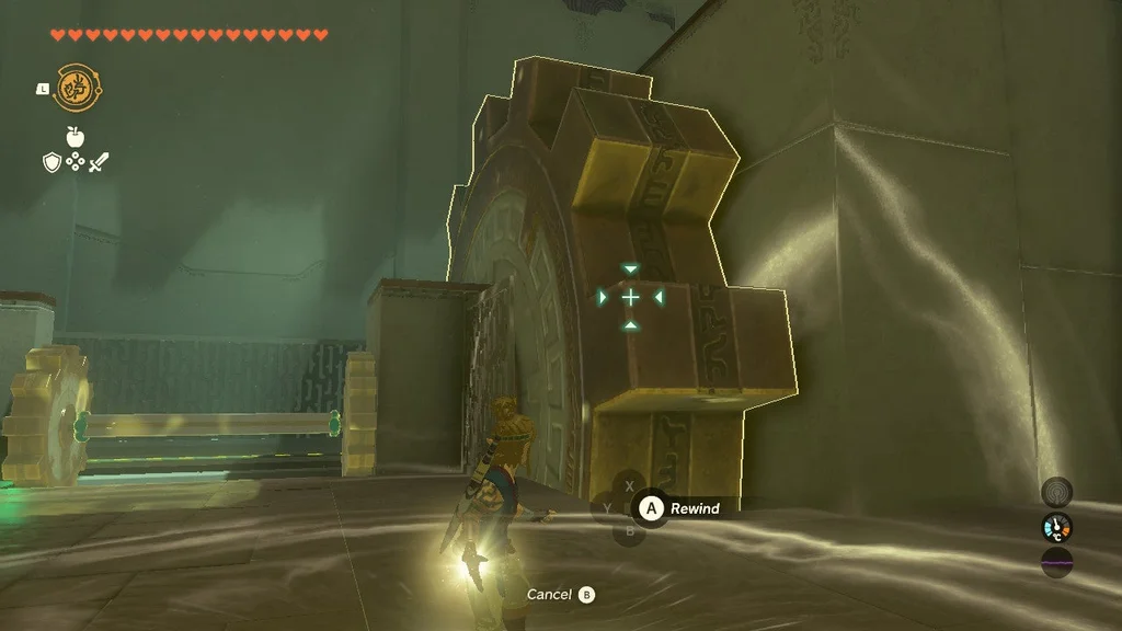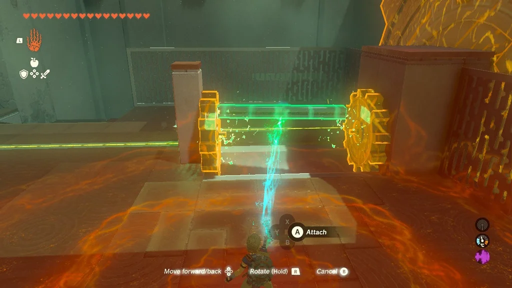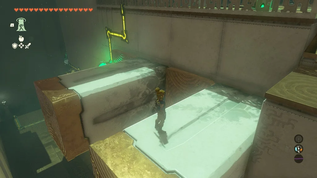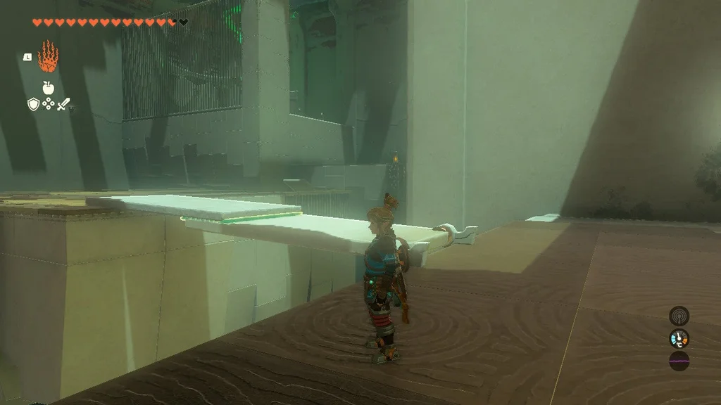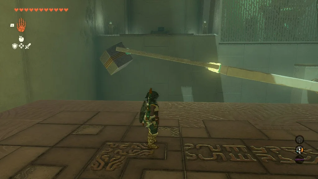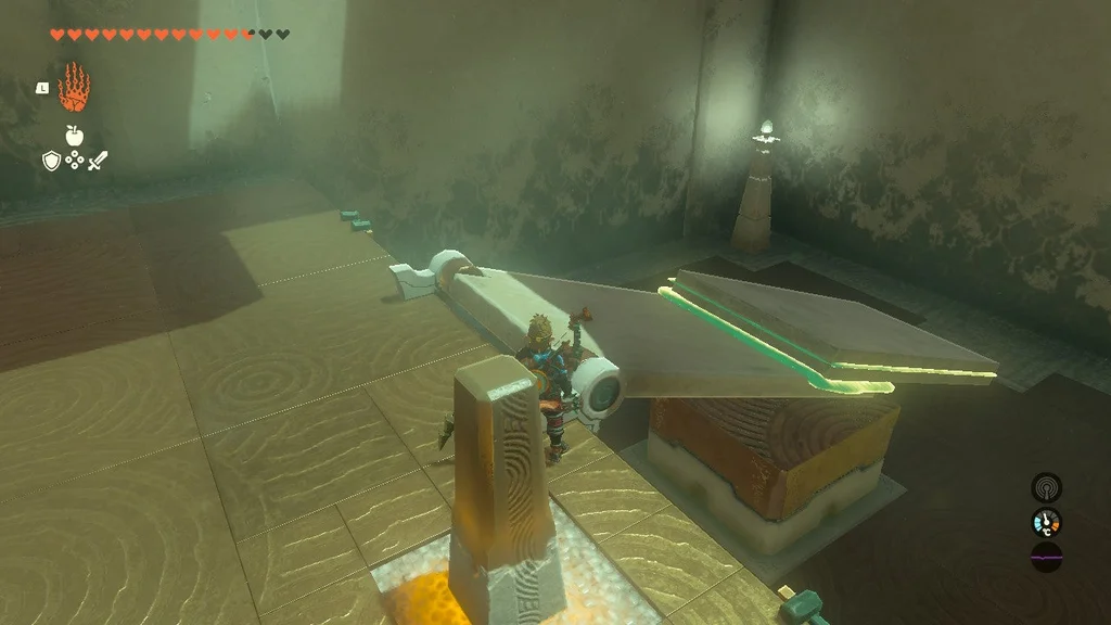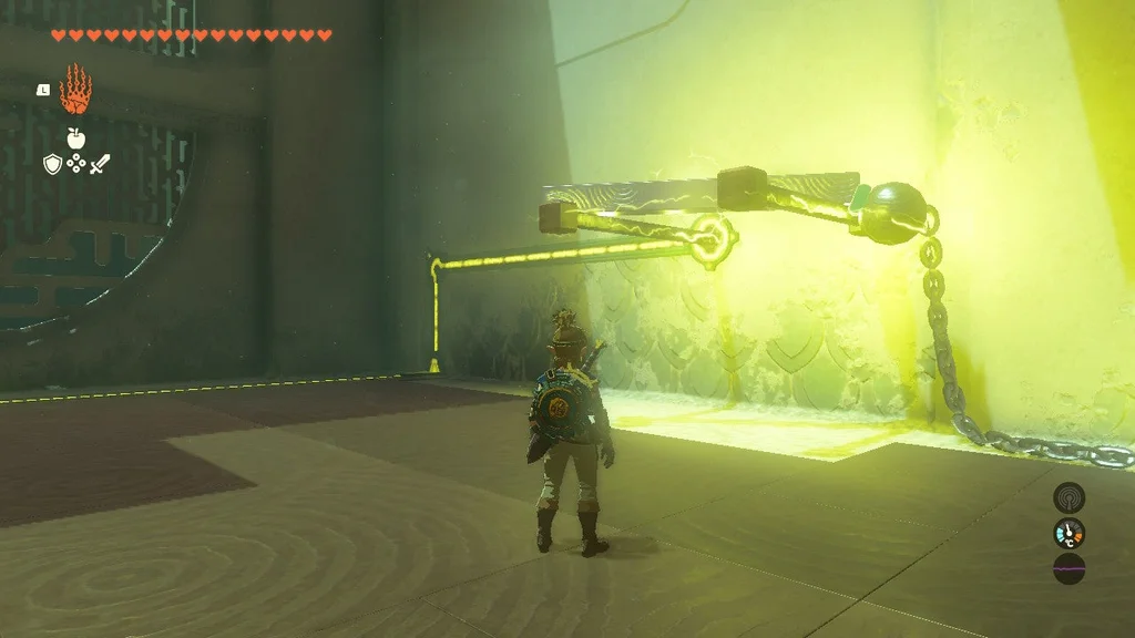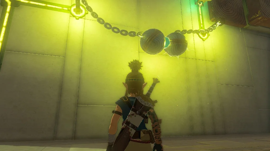 У першій головоломці цього храму вам потрібно привести в дію велику шестерню, використовуючи електрифіковану залізну кулю ліворуч і неактивну, що висить вище. Наблизивши їх, ви створите систему, яка дозволяє рухатися спорядженню. Однак, як тільки кулька з приводом впаде, механізм зупиниться. Усе, що вам потрібно зробити, це за допомогою Ultrahand з’єднати дві залізні кулі, щоб увімкнути живлення.