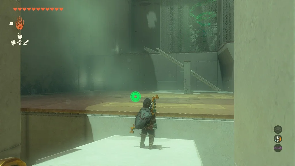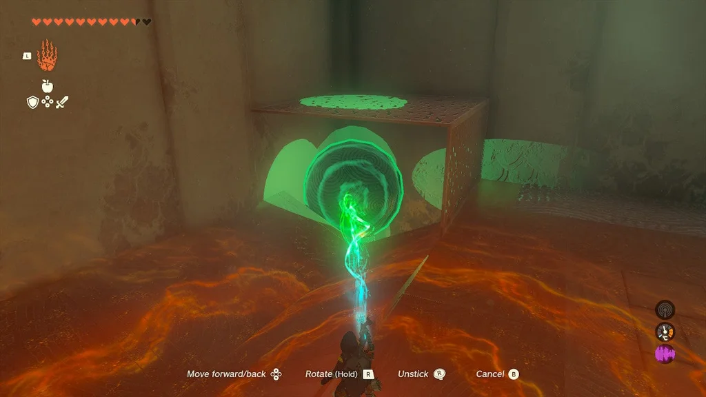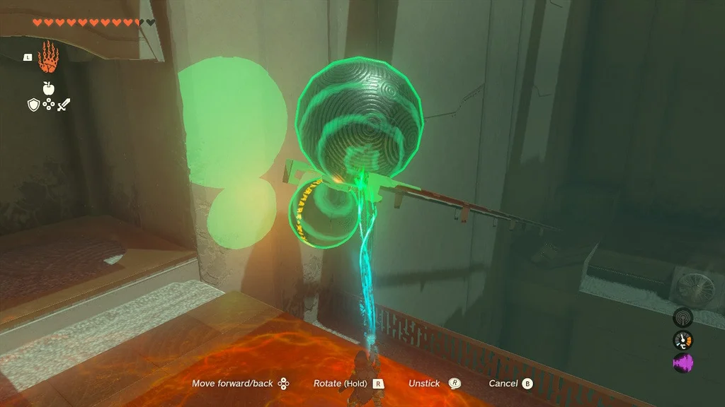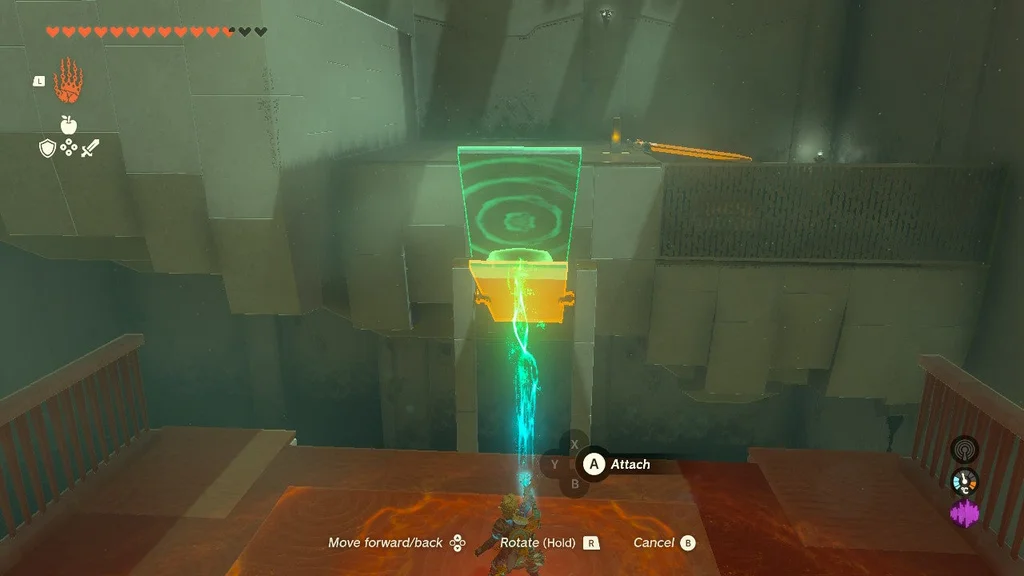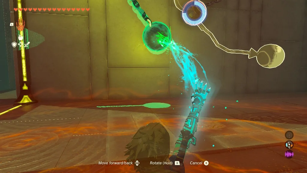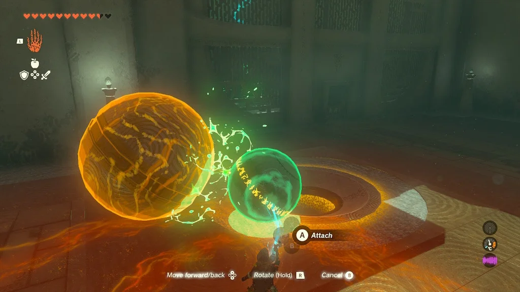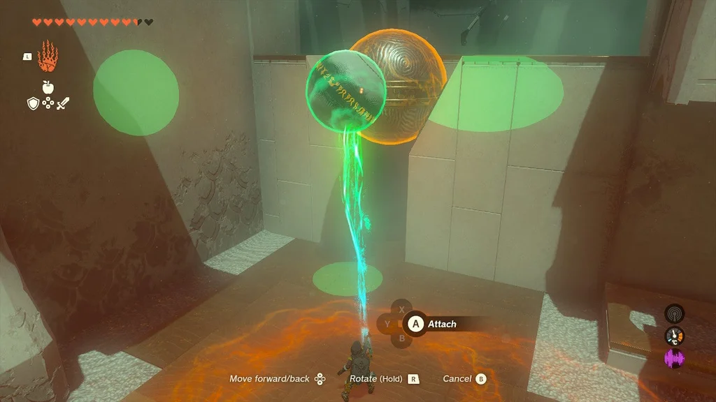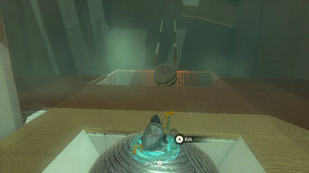 Але вам потрібно зловити його на дні за допомогою Ultrahand! Тепер обережно перемістіть ОБИДВІ СФЕРИ з зони валу до цілі. Від’єднайте помаранчеву сферу та помістіть її в поглиблення/ціль, щоб вийти зі святині.