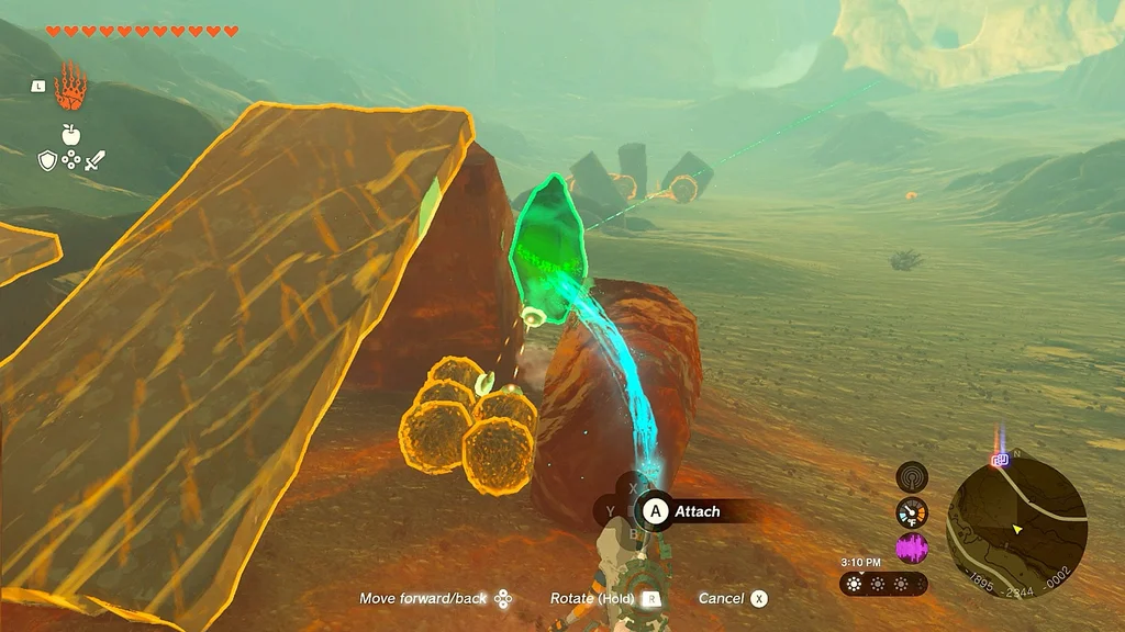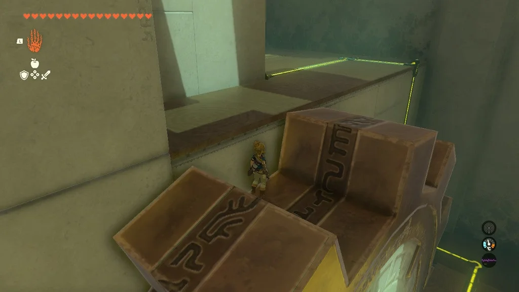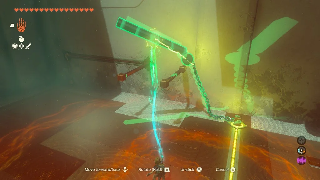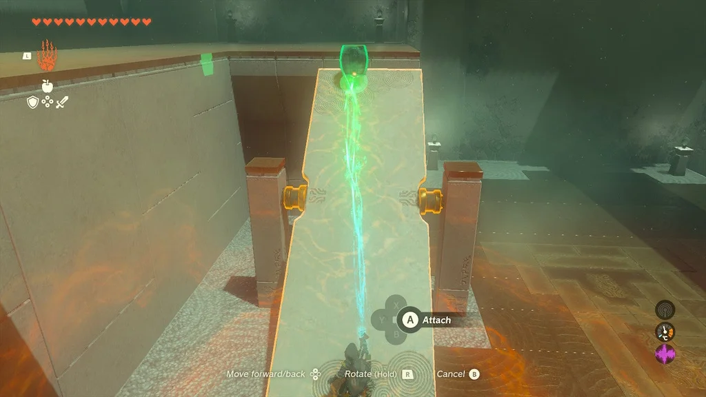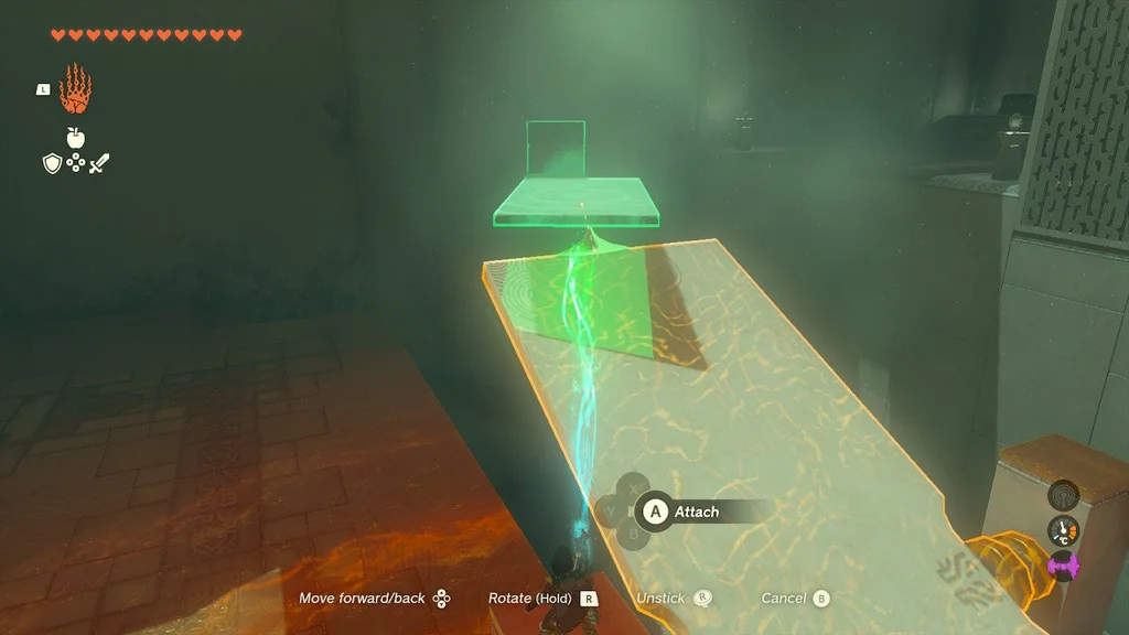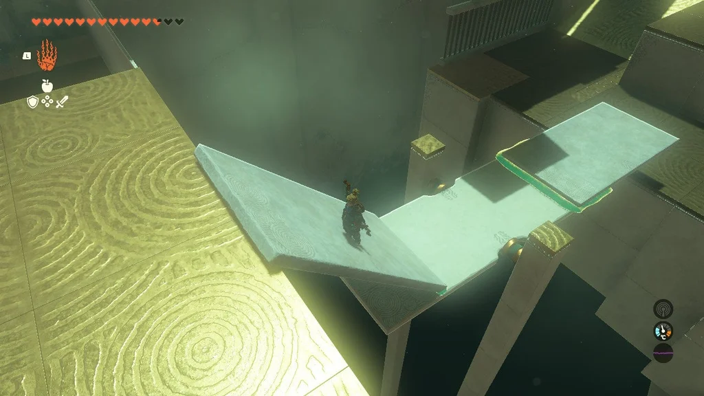 Встаньте на вищий виступ, який виходить на щілину, і прикріпіть до гойдалки кам’яну плиту так, щоб вона нахилилася до вас і приземлилася на землю. Це можна зробити з нижньої землі, але трохи легше побачити, що ви робите з Ultrahand, коли ви перебуваєте вище.