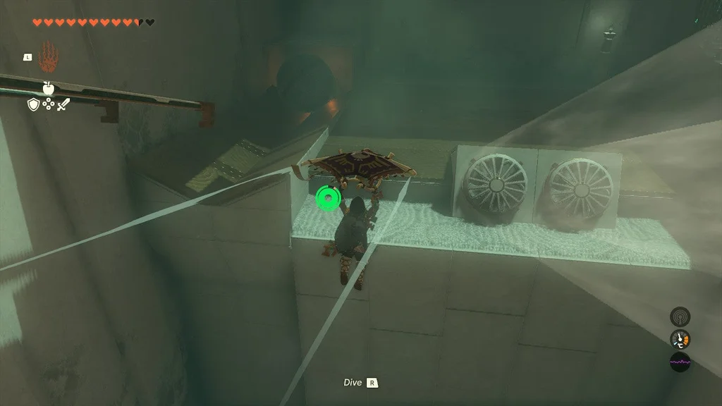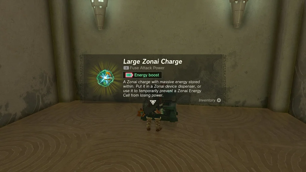 Використовуйте Вознесіння на виступі ліворуч, щоб піднятися на платформу з металевою сферою. Опустіть його вниз і покладіть прямо перед грудьми в щілину. Ви можете стрибати та стрибати на параплані через щілину до платформи скрині та діставати звідти свій «Великий заряд Зонай».