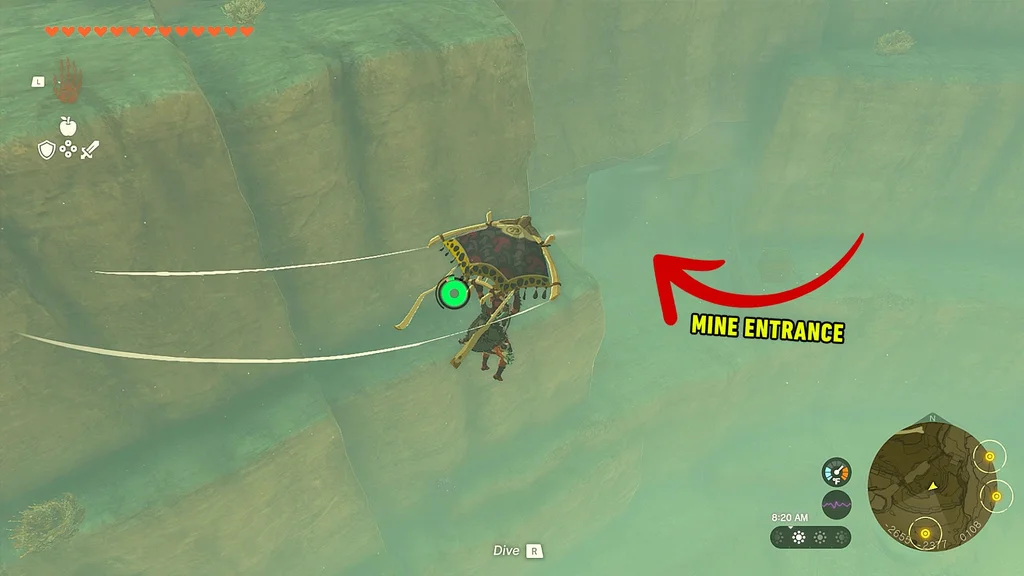 Продовжуйте ковзати (іноді знижуючи висоту), доки не побачите точку на вашій міні-карті, що наближається до вас. Якщо ви впали досить низько, ви побачите гігантську стіну. Продовжуйте кидати, доки не побачите двері в стіні біля дна, які ведуть до шахти Герудо-Каньйон.