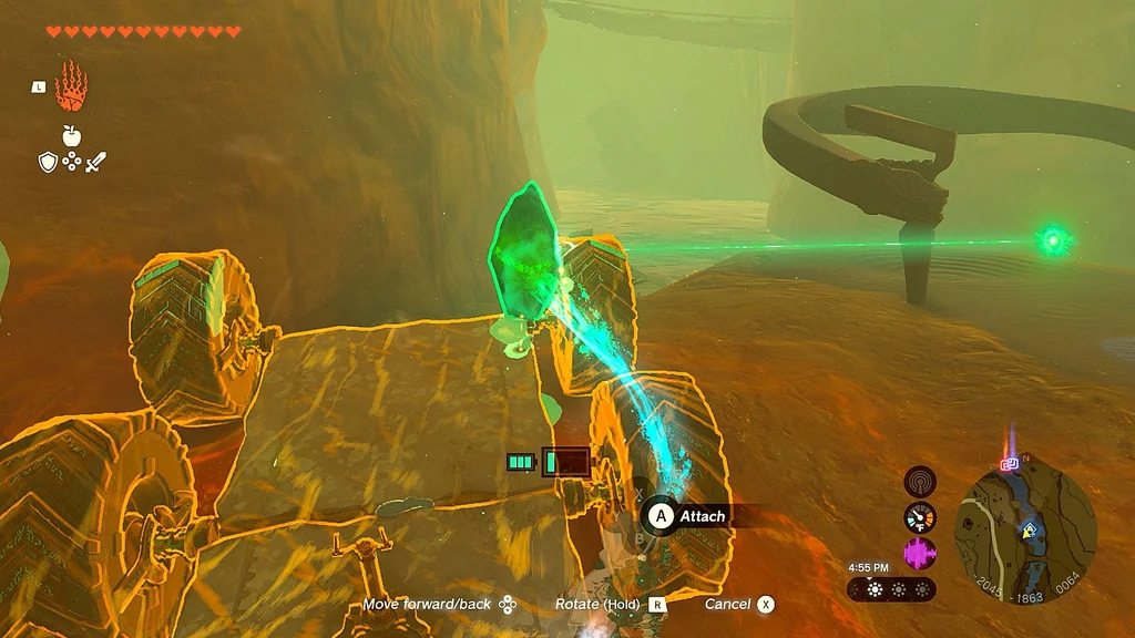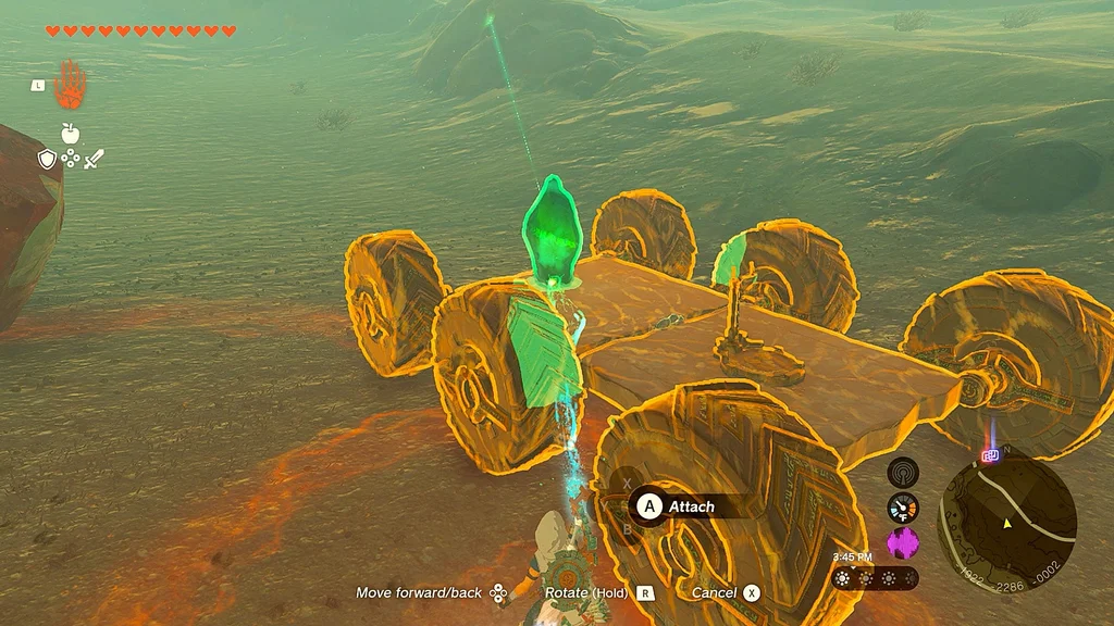 Використовуючи Ultra Hand, з’єднайте ці дві деталі разом, щоб створити керований шестиколісний автомобіль. Прикріпіть кристал Shrine спереду та почніть свою подорож назад до Shrine, слідуючи за променем світла на північ.
