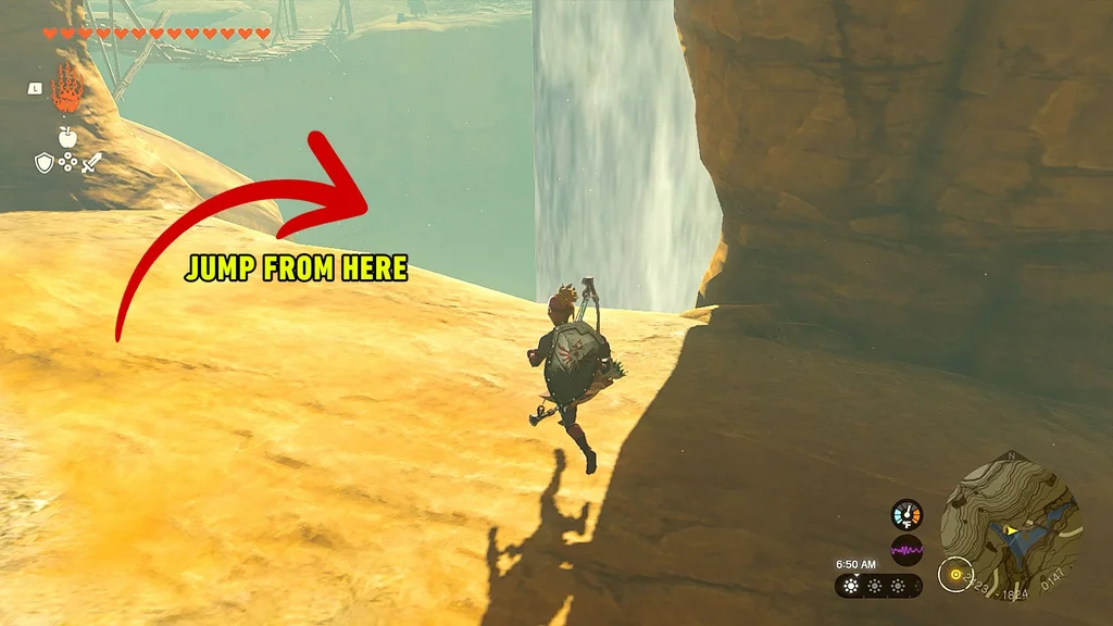 Продовжуйте падати повз них, поки не опинитесь біля самого дна каньйону. Коли ви опинитесь у самому низу, ви знову побачите жаб’ячий вівтар із смолоскипами, засунутими під одним із мостів, біля стіни. Киньте свої банани, а потім швидко подорожуйте назад до башти Gerudo Canyon Skyview.