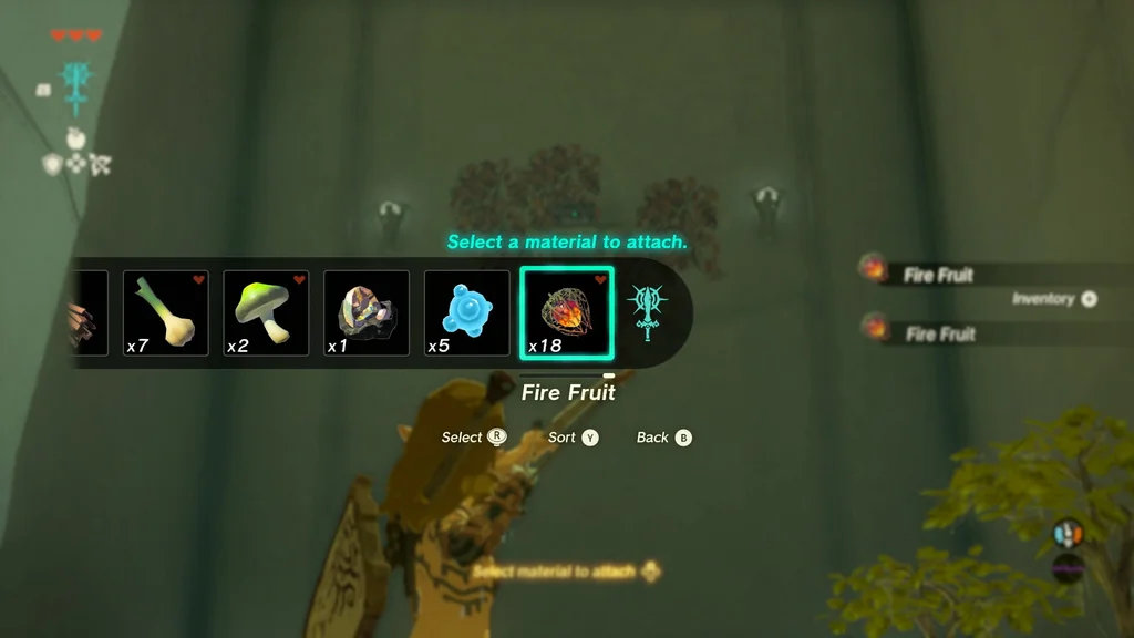 Натягніть лук, утримуючи ZR, а потім натисніть на D-pad, щоб прокрутити всі доступні матеріали. Виберіть «Вогняний плід», і ви побачите, що тепер він з’єднаний із вашою стрілою та може бути запущений як вогняна стріла, щоб запалити деревину та опустити скриню, у якій міститься маленький ключ.