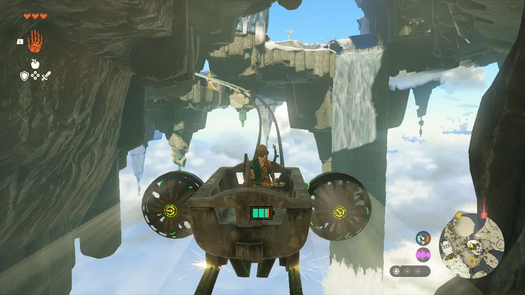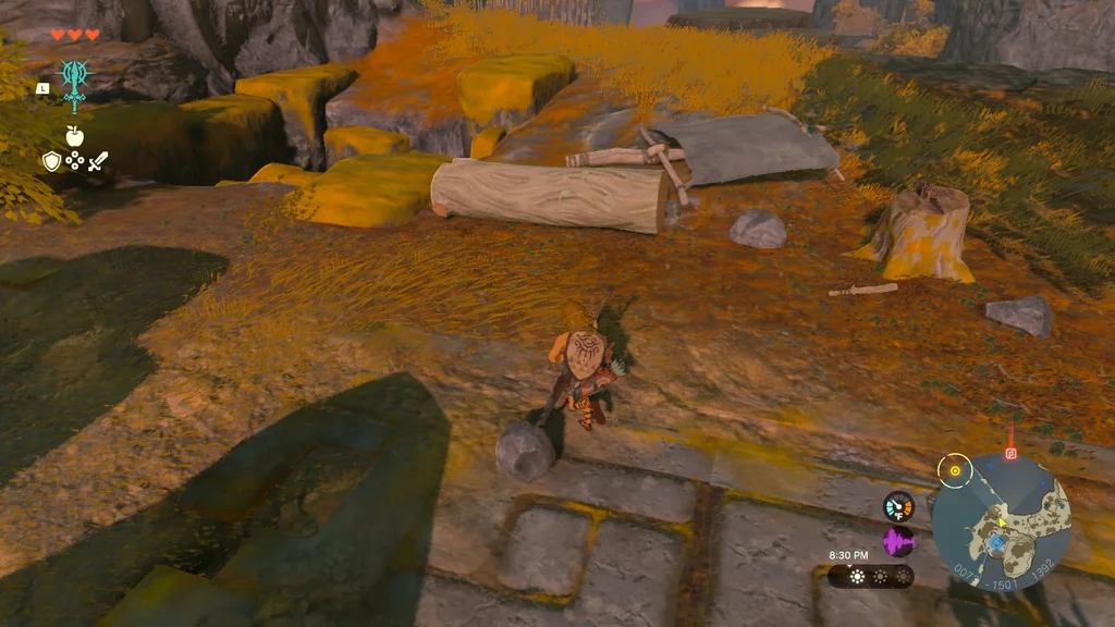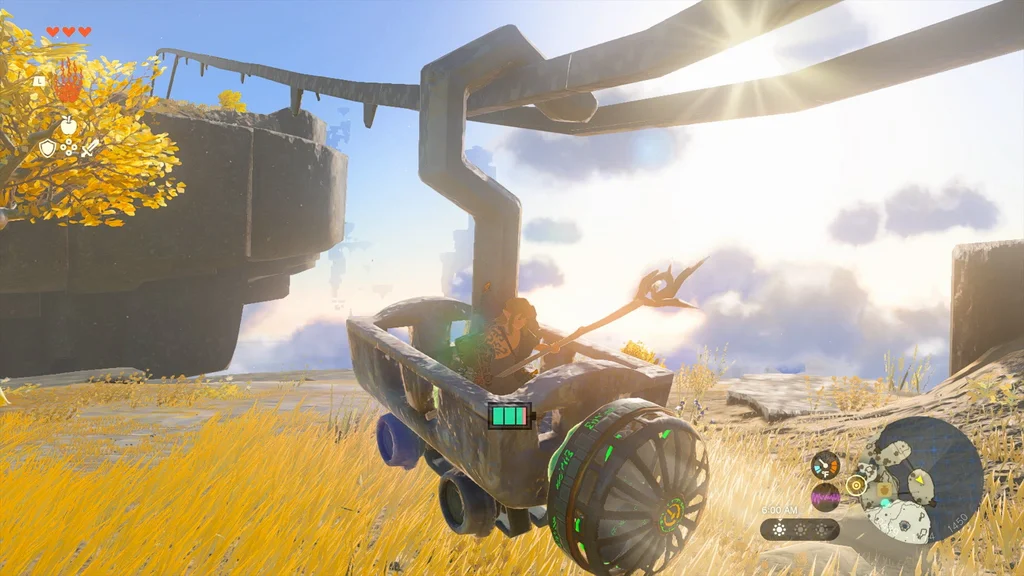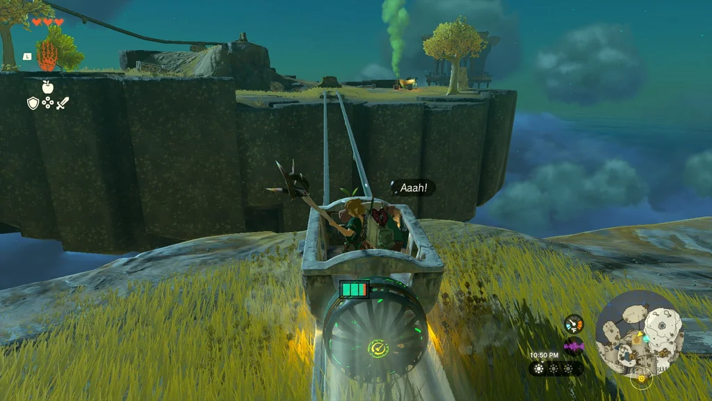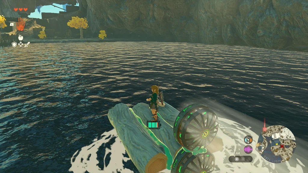 Повернувшись до ставка, настав час зробити свій власний моторний пліт Zonai. Використовуйте Ultrahand, щоб склеїти принаймні три колоди поруч, а потім підніміть і нахиліть один або два віяла, щоб приклеїти їх до кінця плота. Коли ви б’єте віяла, вони активуються та використовують енергію з ваших акумуляторів для роботи протягом обмеженого часу (який можна продовжити, використовуючи Zonai Charge у вашому інвентарі). Навіть з одним акумулятором у вас буде більше ніж достатньо енергії, щоб переплисти водойму на новому човні!