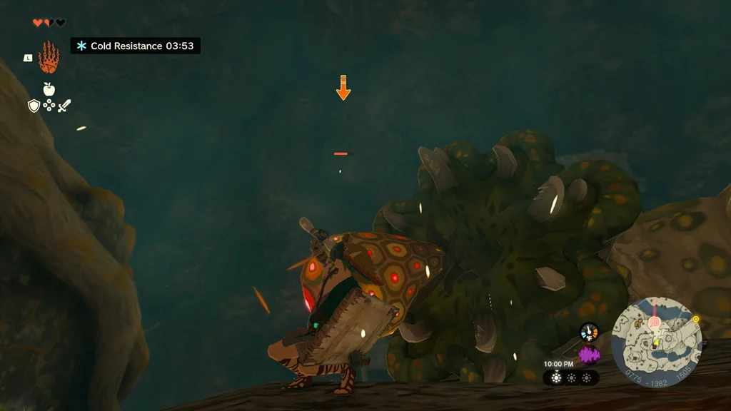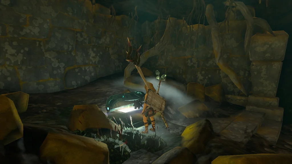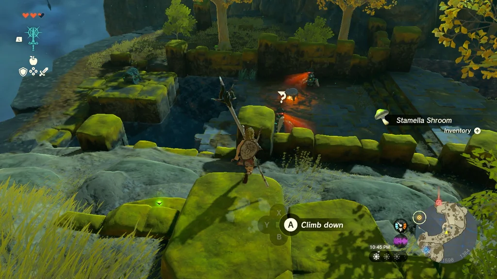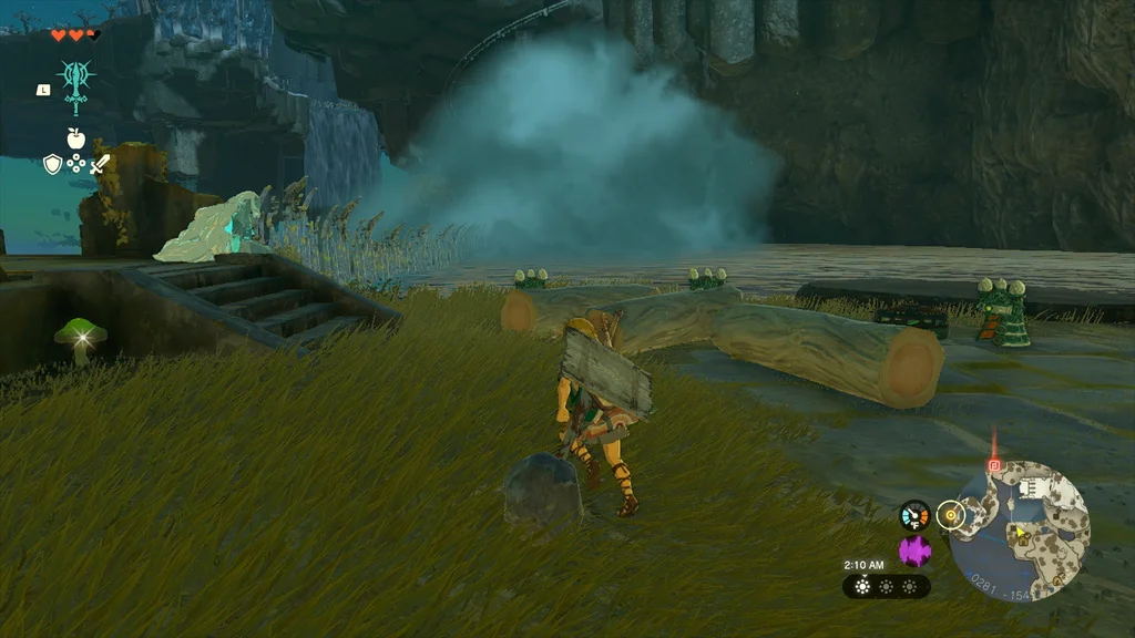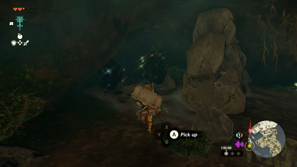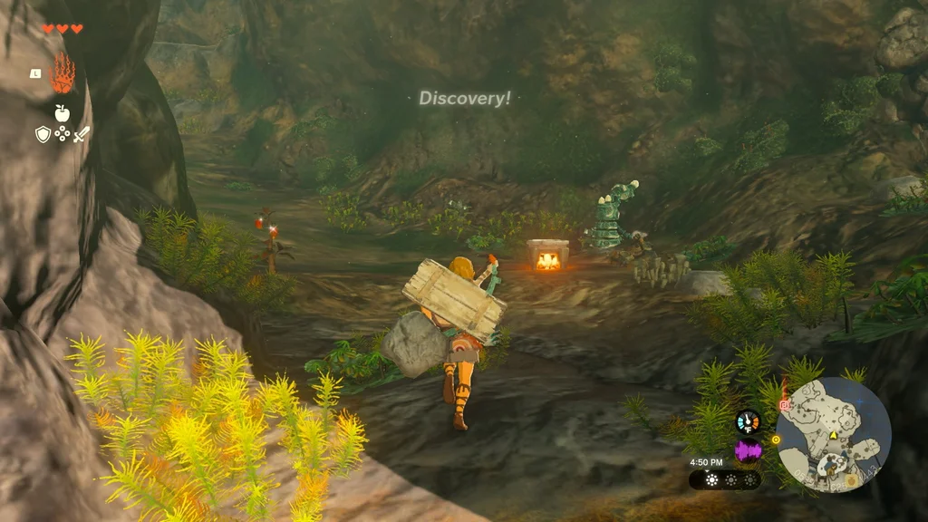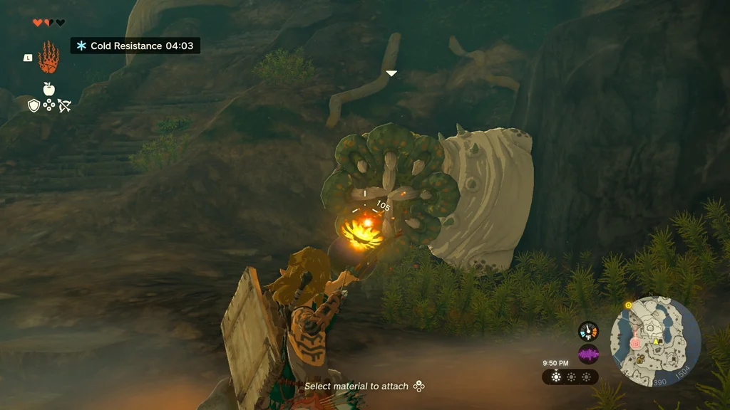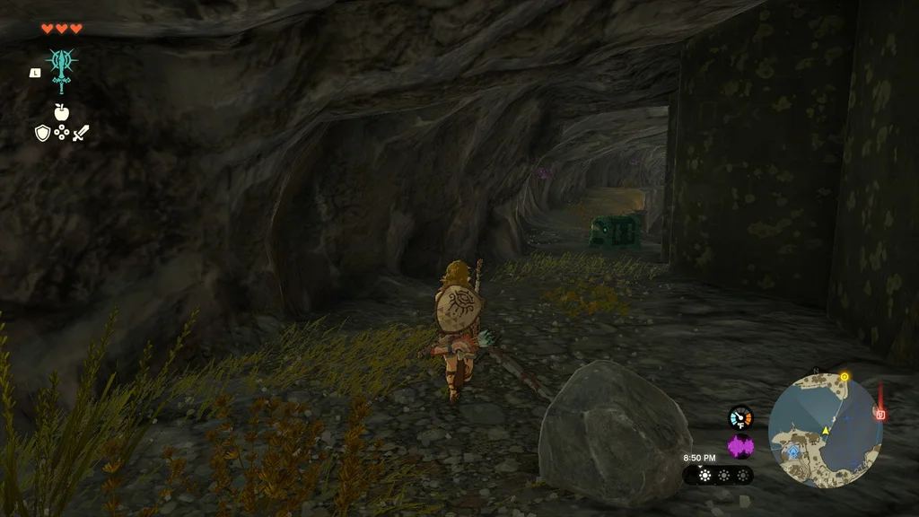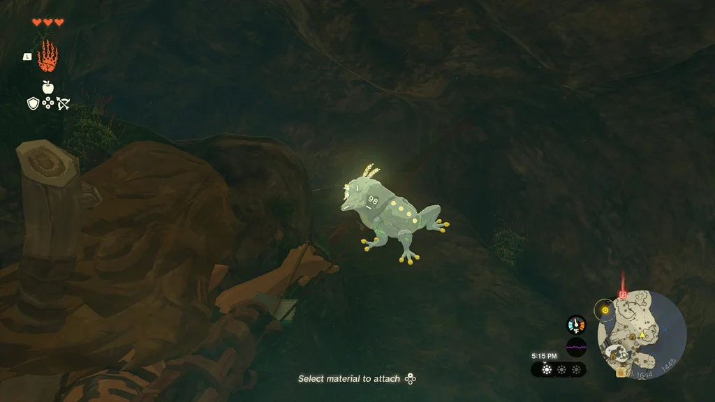 Ви зможете помітити жабу Буббула, яка стрибає вздовж стін, обов’язково вдарте її з лука та зберіть четвертий самоцвіт Буббула. У цій печері також росте кілька квітів бомби, які слід збирати відразу. Вони замінять типові бомбові стріли з Breath of the Wild і будуть неймовірно корисними в боях або прокладанні шляхів через уламки!