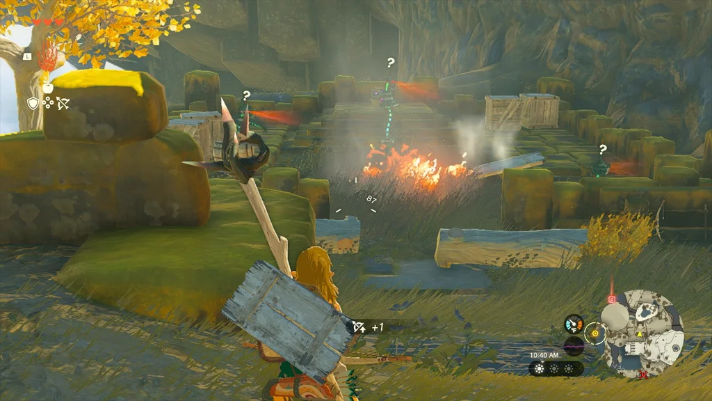 Попереду ще один табір солдатських конструктів, які охороняють скриню, але вам варто бути обережними, вступаючи з ними в конфлікт. У одного не лише щит, а й інший створив власну зброю із запалом — поєднавши палицю з великою дерев’яною дошкою.