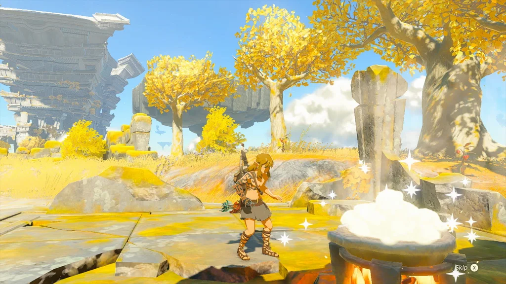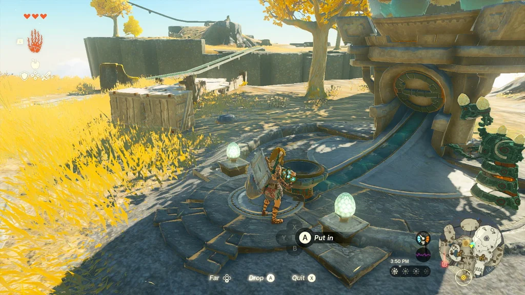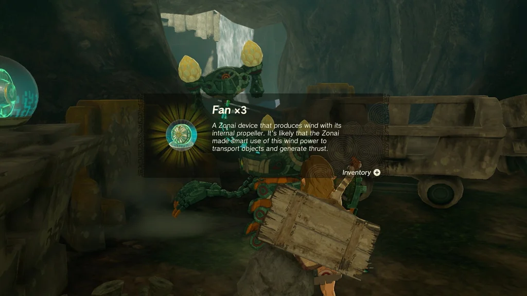 Конструкція поблизу помітить, що пристрій роздаватиме певні типи пристроїв Zonai в обмін на плату Zonai — що більше ви підкинете, то більше отримаєте натомість. Візьміть кілька, щоб спробувати, і ви отримаєте кілька вентиляторів, випромінювачів полум’я та портативних горщиків: