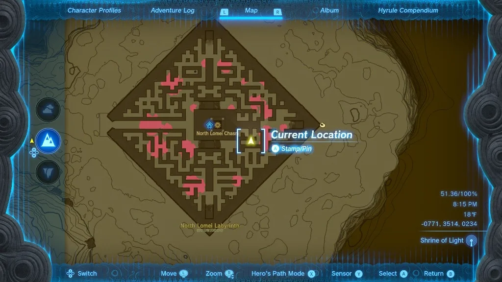 Найшвидший спосіб повністю обійти лабіринт — скористатися одним із цих трюків, щоб досягти вершини стін, пробігти до південно-східного кута більшої середньої секції (показано нижче), а потім стрибнути назад. Звідти ви можете піднятися по короткій драбині та пройти стежкою із соснових шишок до центральної кімнати та активувати святиню.