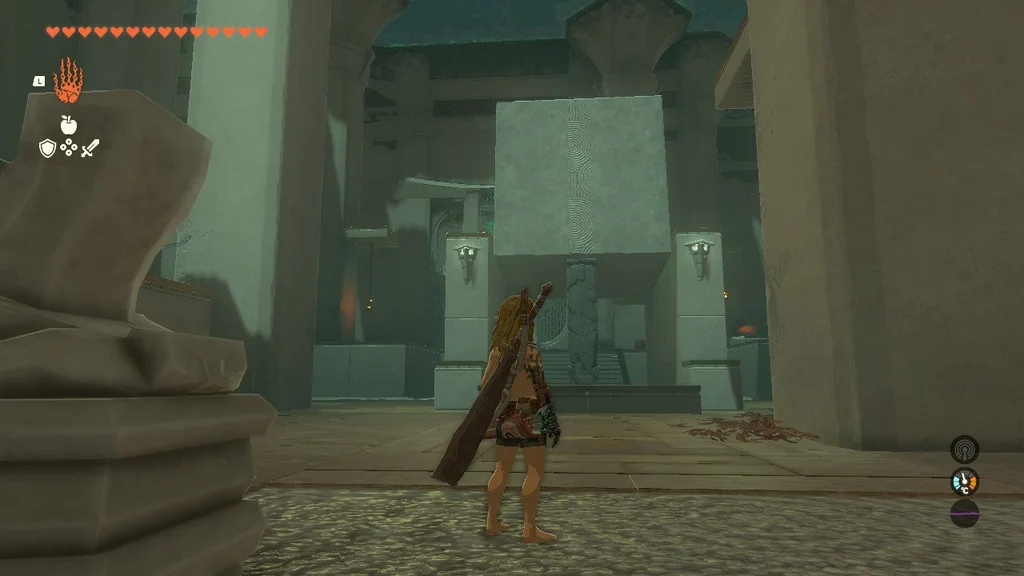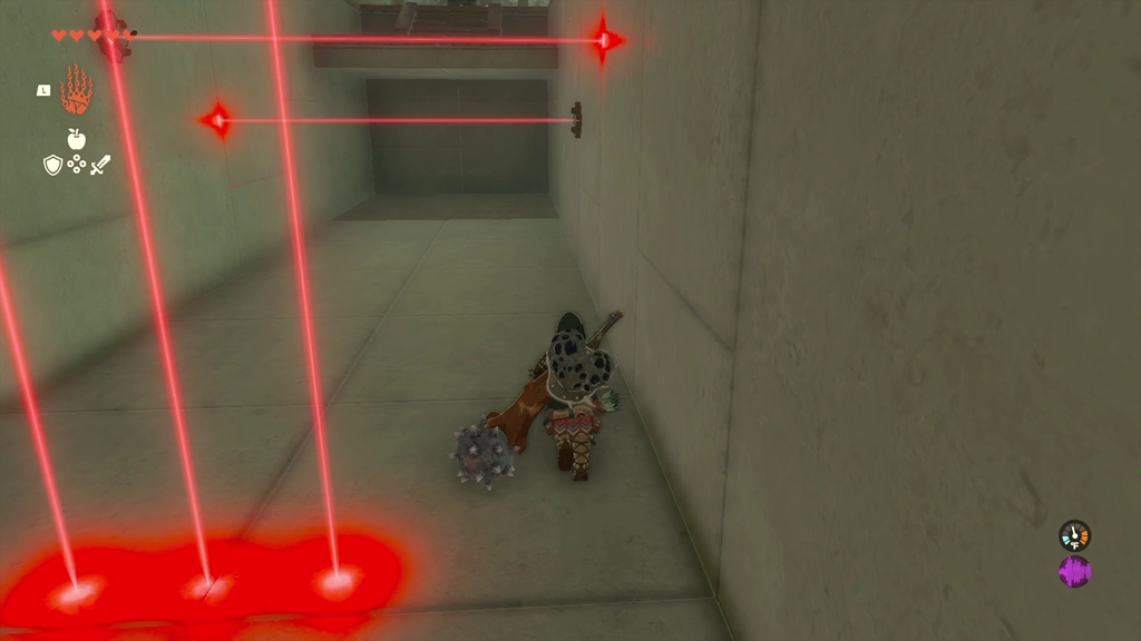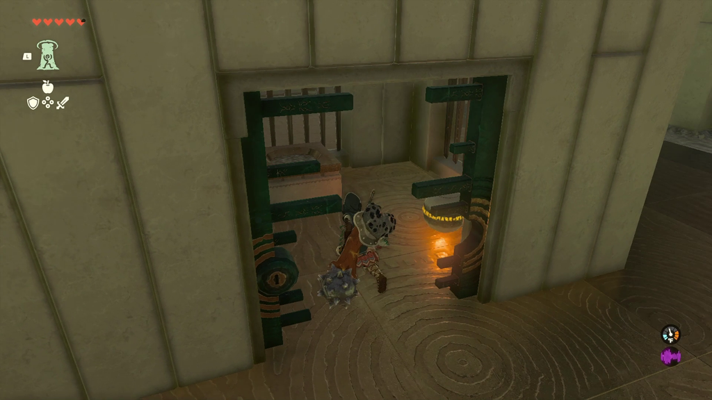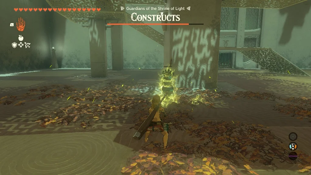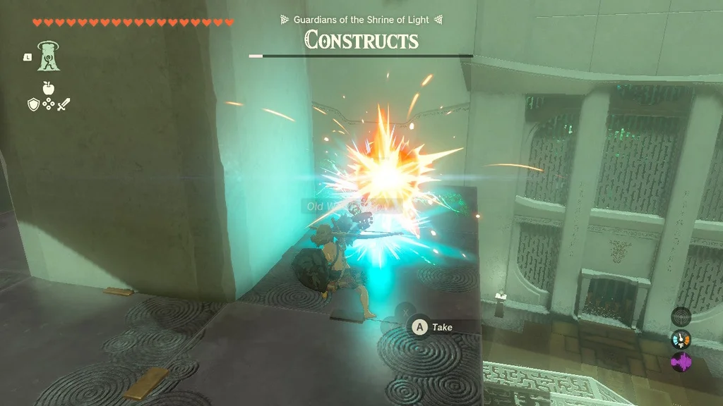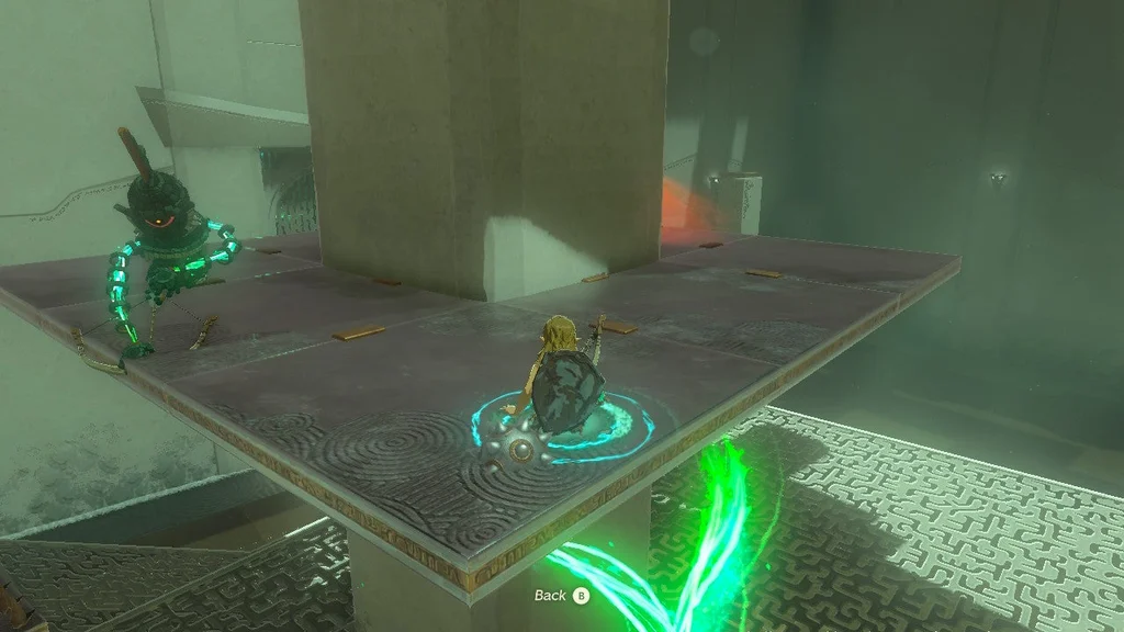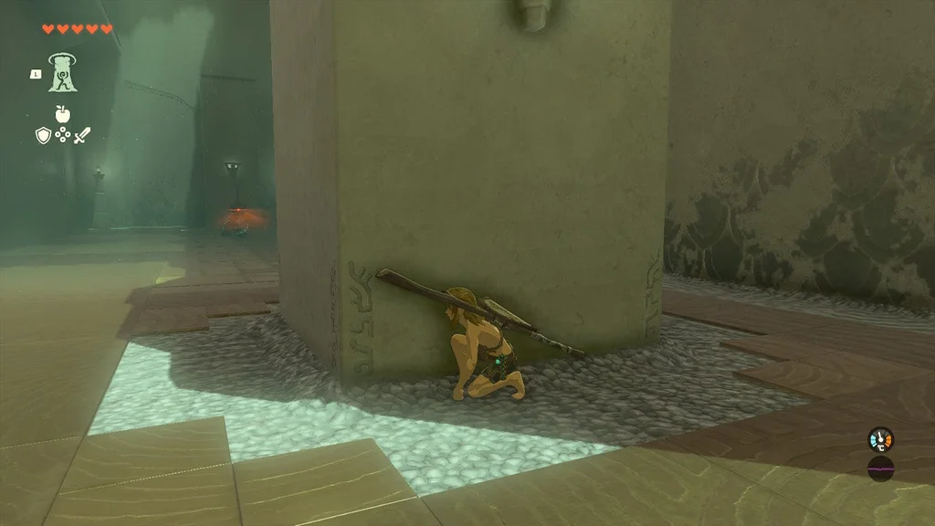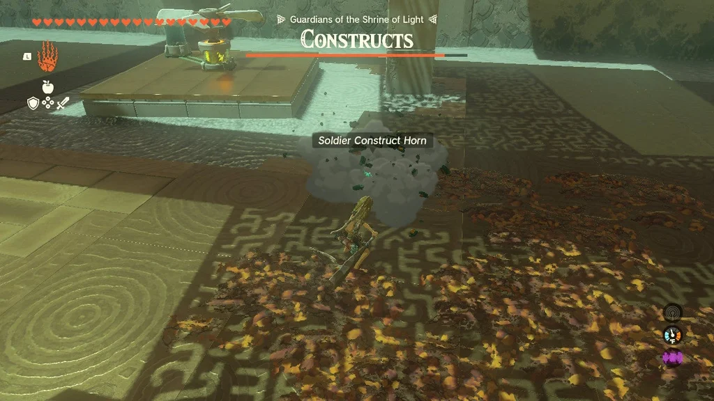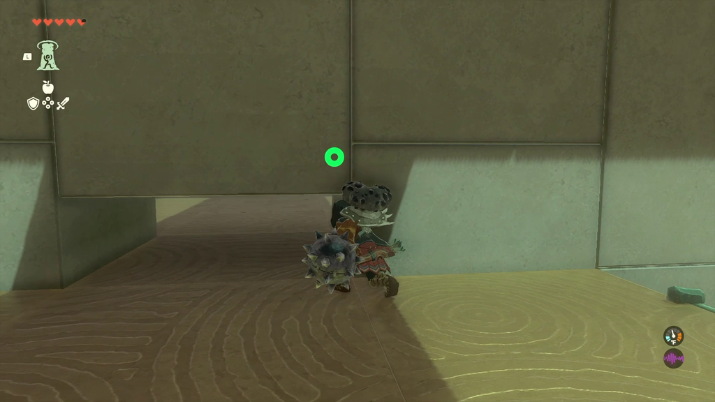 Конструкції солдата Zonai 1 чекають праворуч і ліворуч кімнати, кожен із яких супроводжується конструкцією Soldier Zonai 2. Ще дві конструкції солдата Zonai 2 затримуються праворуч ззаду. Загалом шість ворогів займають таку позицію, що якщо ви залишитесь на їхньому боці, ви, швидше за все, не привернете увагу інших.