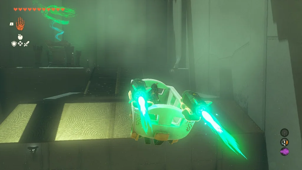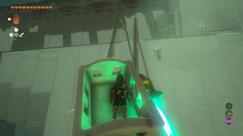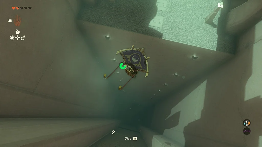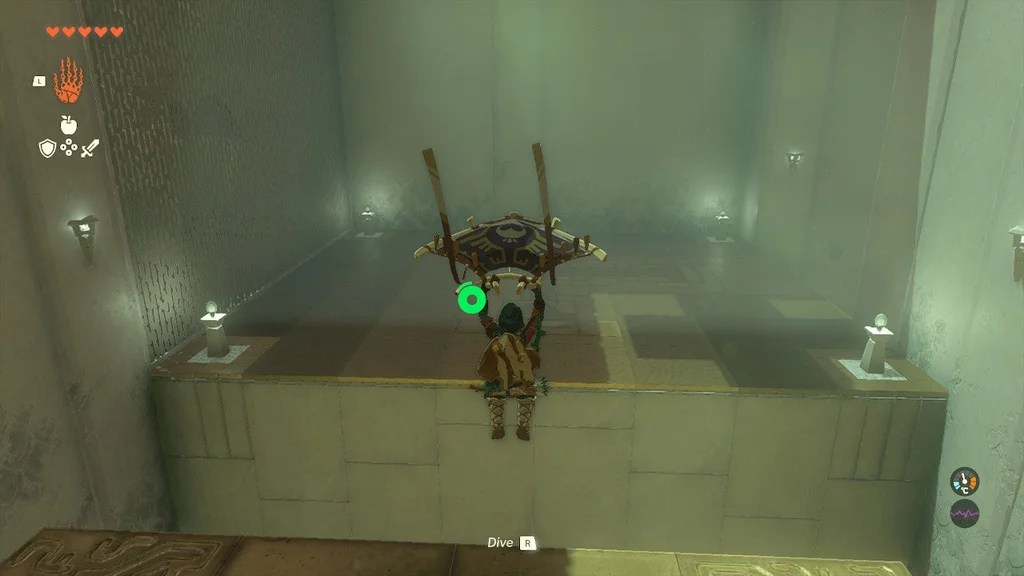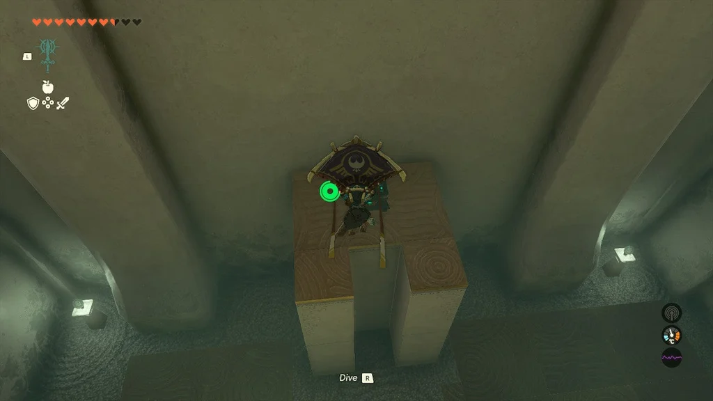 Пора Лінку подихати повітрям. Прикріпивши дерев’яну дошку, станьте на її кінець. Потім за допомогою Ultrahand знову підніміть коробку. Підніміть його високо над іншою половиною білої плити та опустіть, щоб він піднявся в повітря. Піднявшись високо, використовуйте планер, щоб повернутися до входу та ковзати вниз до платформи скрині зі скарбами.