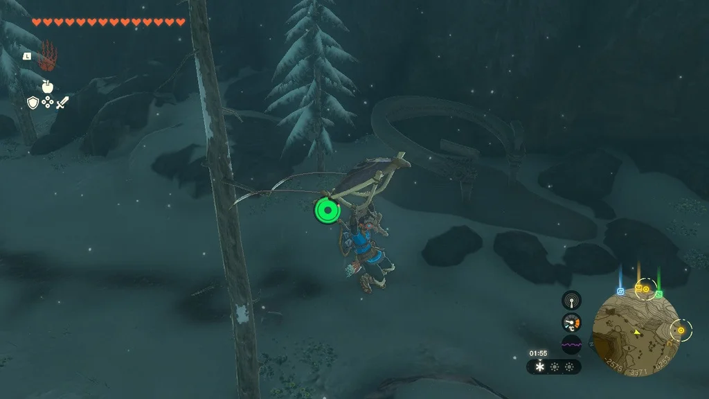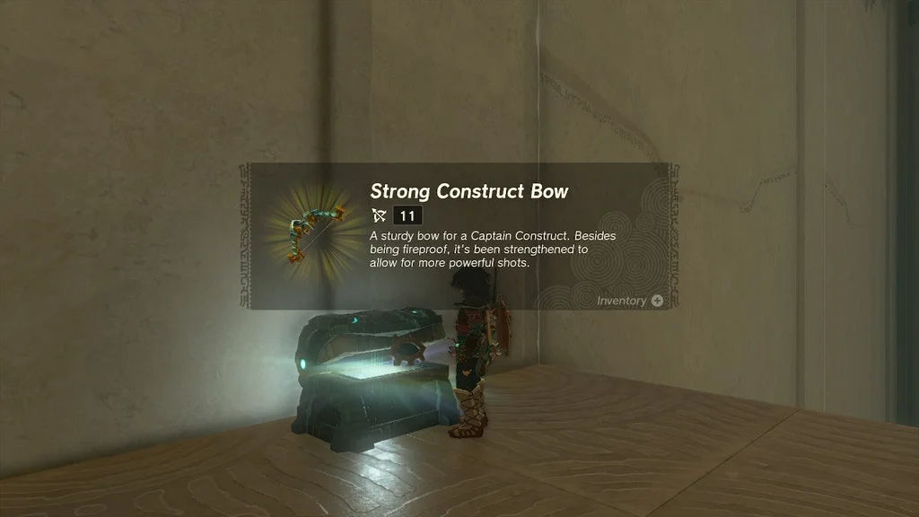 На одній із будівельних платформ на південно-західному боці є Скриня зі скарбами. Витягніть лук, пливучи на параплані на висхідній течії, і ви зможете заморозити час і вистрілити конструкції в обличчя, щоб приголомшити її. Приземліться, візьміть свій скарб, «Лук міцної конструкції»», і ви зможете полетіти на параплані без проблем.