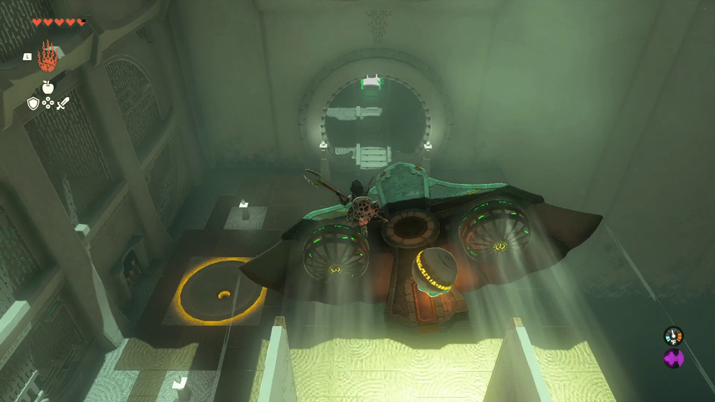 Оскільки вам більше не потрібно, щоб ці ворота були відкриті, візьміть м’яч ще раз за допомогою UltraHand і прикріпіть його до планера. Помістіть планер на поручні, що ведуть від платформи, застрибніть на планер і вдарте вболівальники, щоб перенести Лінка та потрібний вам м’яч назад до входу в храм, де ви можете помістити його в отвір, щоб відкрити останні ворота.