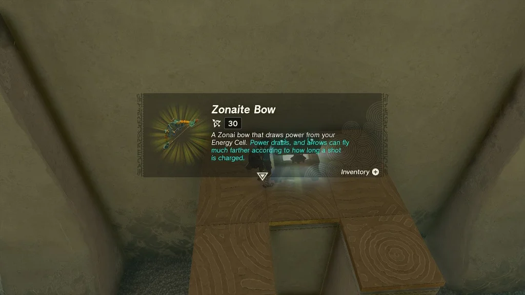 Підійдіть до виступу скрині та спорядіть свій щит – ви підніметеся в повітря, і зможете спуститися на параплані до скрині. Всередині — Зонайтський Лук.