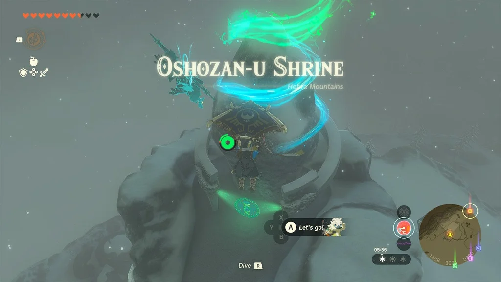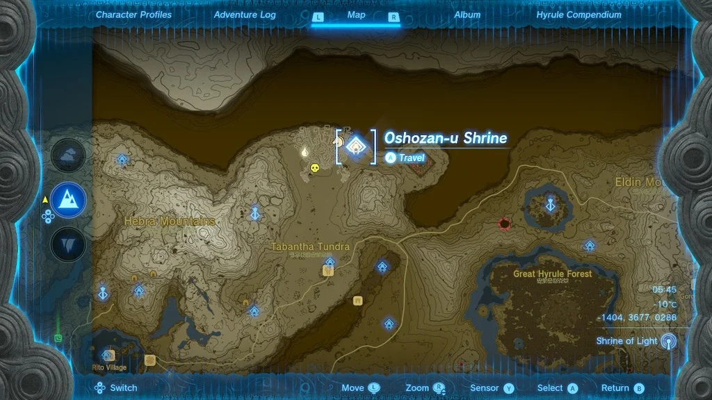 Розташування святині: вам знадобляться два предмети теплого одягу (оскільки ви подорожуєте вгору від землі, щоб дістатися до цього храму) або холодостійкий/зігріваючий еліксир або їжа, щоб дістатися до храму Ошозан-у. Він знаходиться на скелястій, крижаній вершині на крайній півночі Табантха-Сноудрифт у Табантській тундрі. Це коротка поїздка на північ (і її можна побачити з) стайні Сноуфілд.