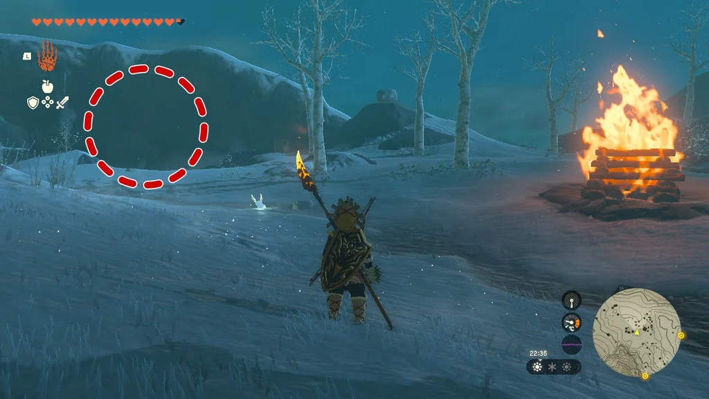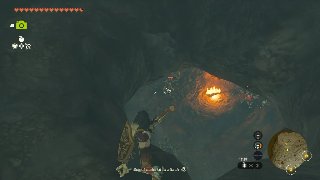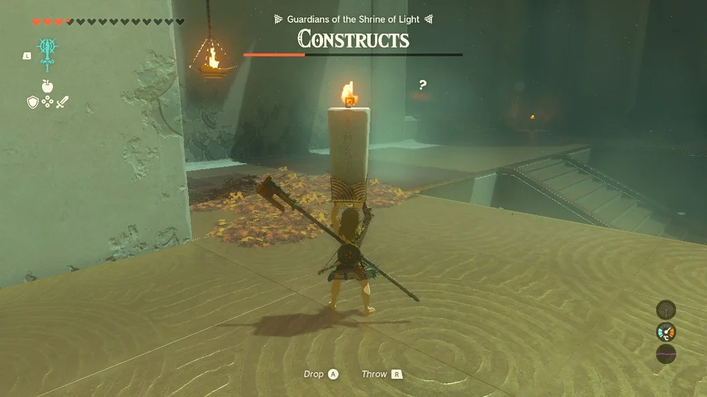 Передбачувана мета ліворуч полягає в тому, щоб використати свічки в кутах і підвісні жаровні, що горять над листям на землі, щоб підпалити шлях позаду вас, коли солдати Zonai йдуть слідом. На жаль, привернути їхню увагу свистками не завжди найкраще, як і заманити їх у ці пастки, які насправді не завдадуть їм великої шкоди. Найкраще спробувати спершу взяти Soldier Construct 2 ліворуч, щоб отримати його спис, а потім дістати його лучника.