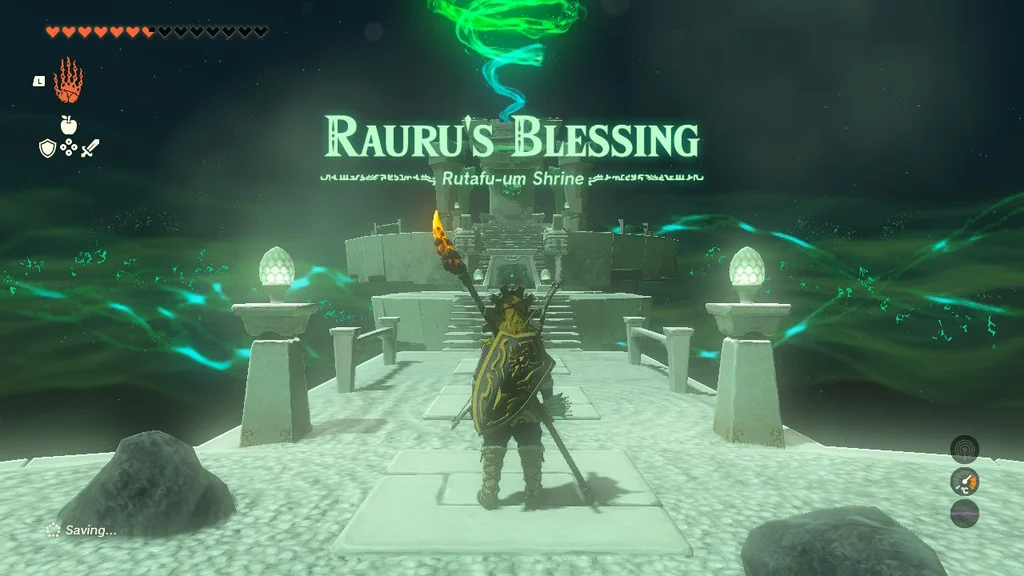 Трохи вище по пандусу, який видно за відкладенням світлого каменю, є святилище Рутафу-ум, позбавлене свого кристалу святилища. Підійдіть, щоб розпочати квест святині.