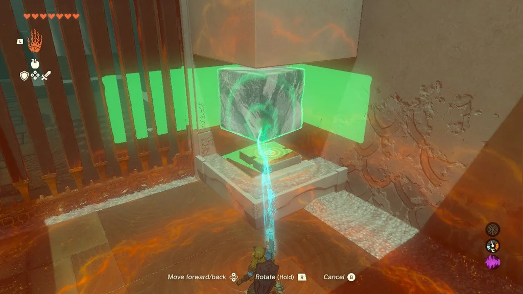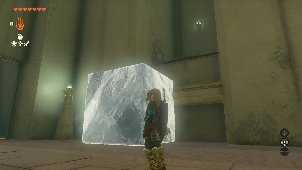 Далі пронесіться повітряним потоком вгору по довгій кімнаті до вищої платформи. Ви побачите, як гігантські кубики льоду постійно падають і тануть у вогні. Використовуйте Ultrahand, і ви побачите велику металеву пластину прямо біля машини для кубиків льоду. Використовуйте його, щоб заблокувати вогонь відразу після того, як кубик льоду повністю розтане, щоб отримати повнорозмірний.