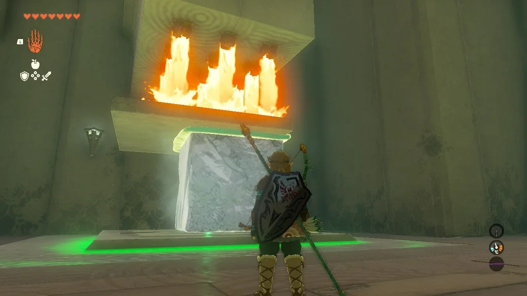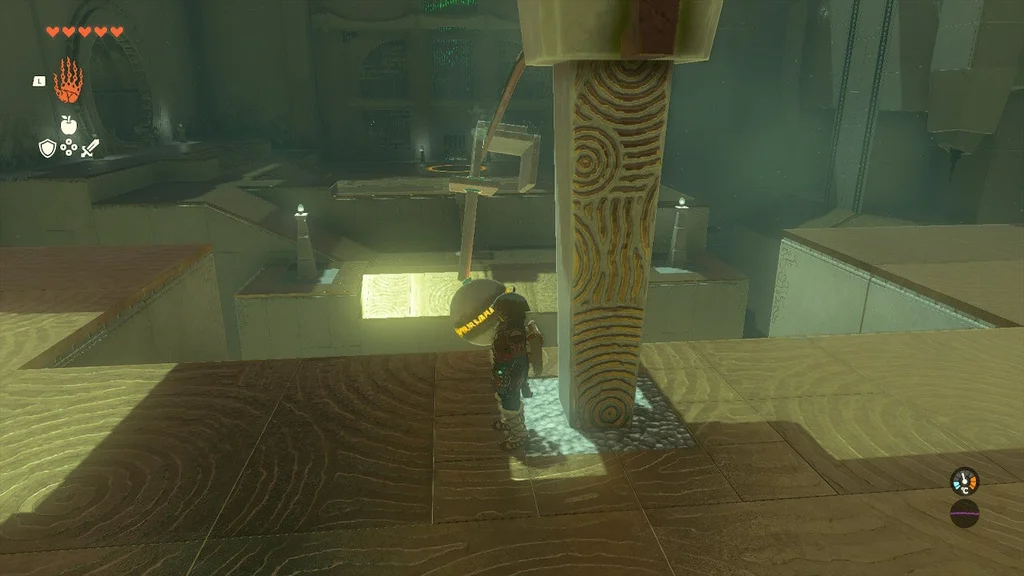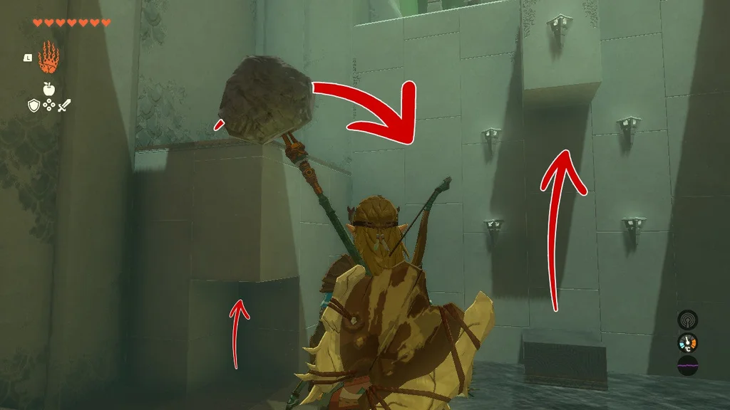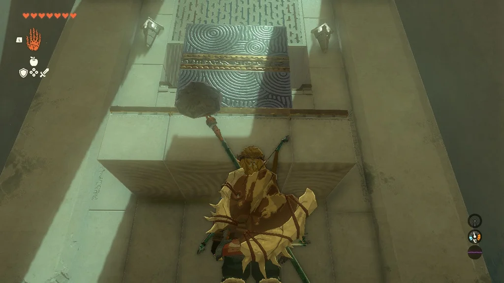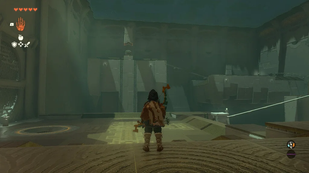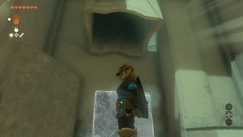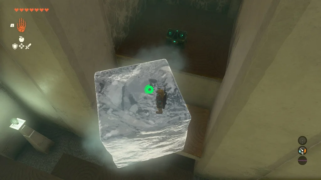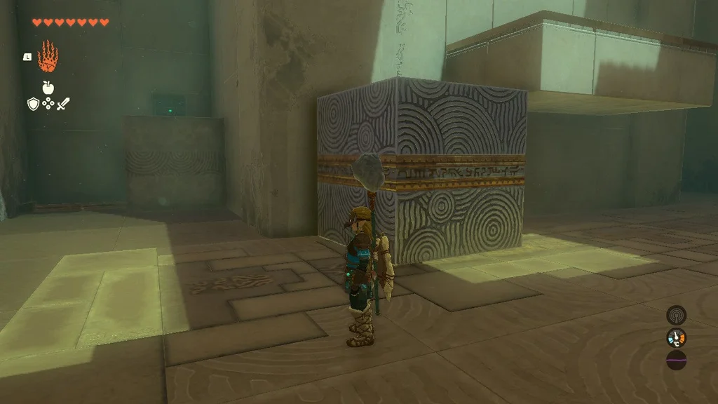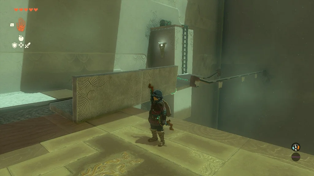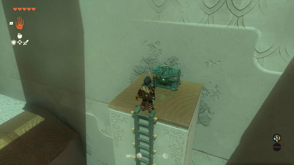 Ліворуч від платформи знаходиться скриня зі скарбами святині, вбудована в стіну з рухомим блоком ліворуч від неї. Використовуйте Ultrahand, щоб покласти блок перед скринею зі скарбами.