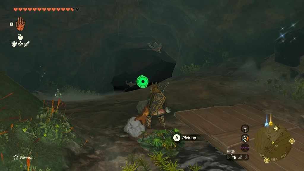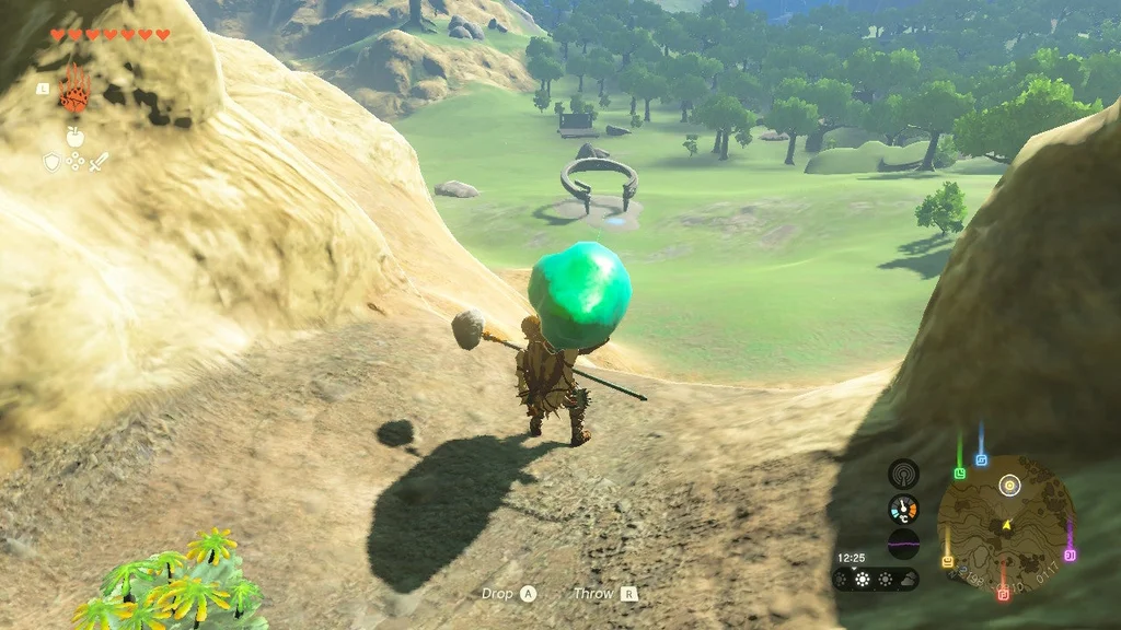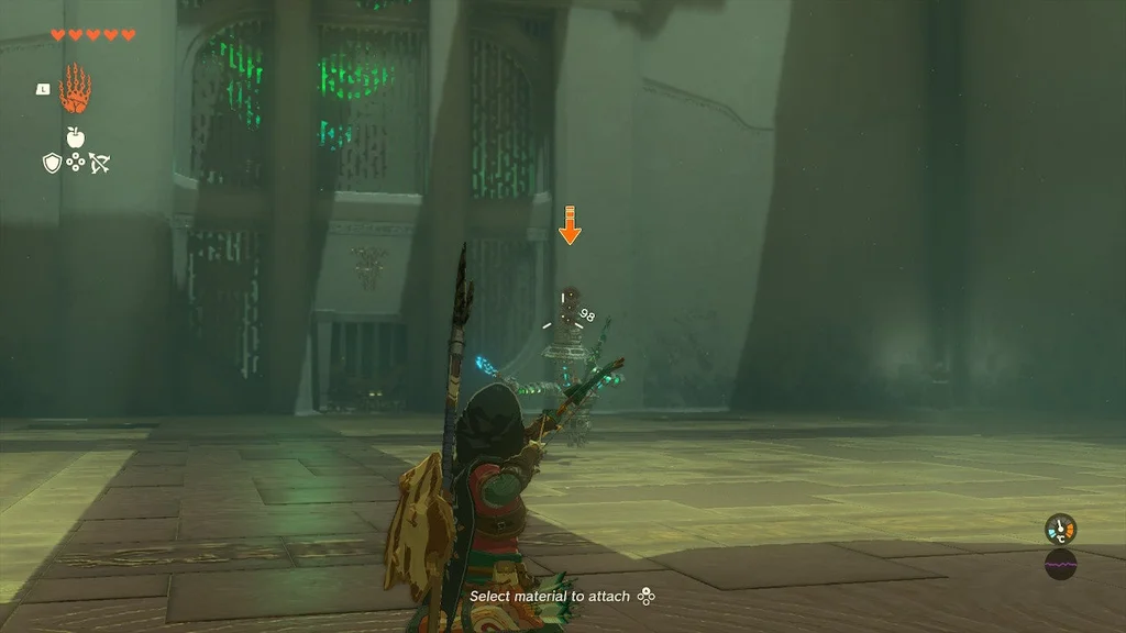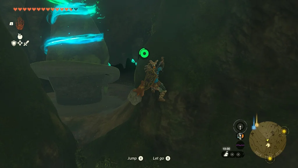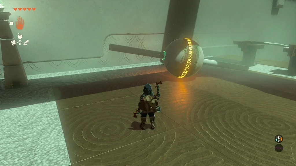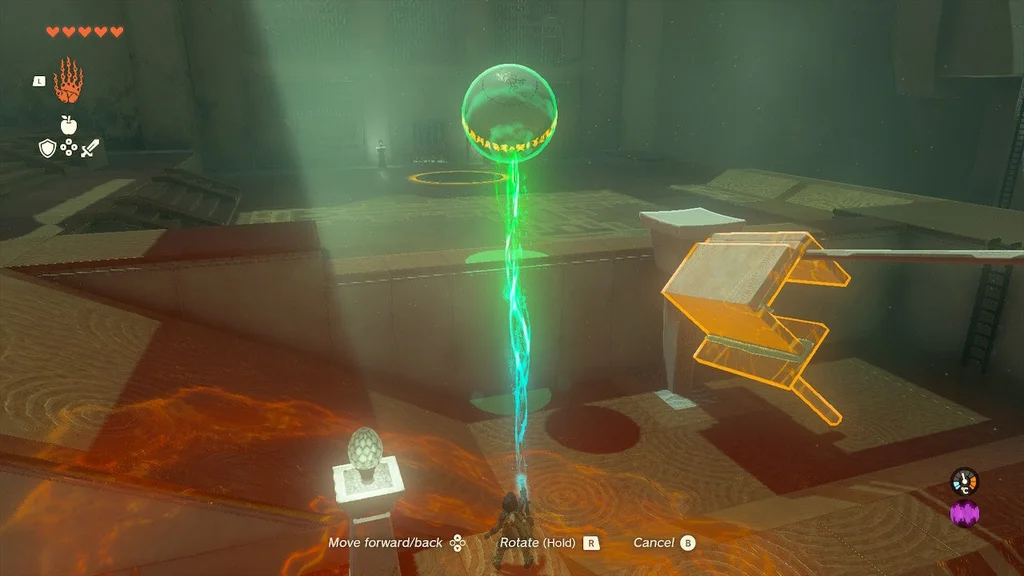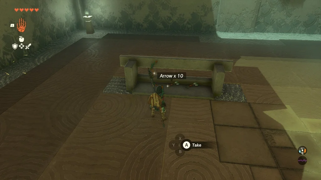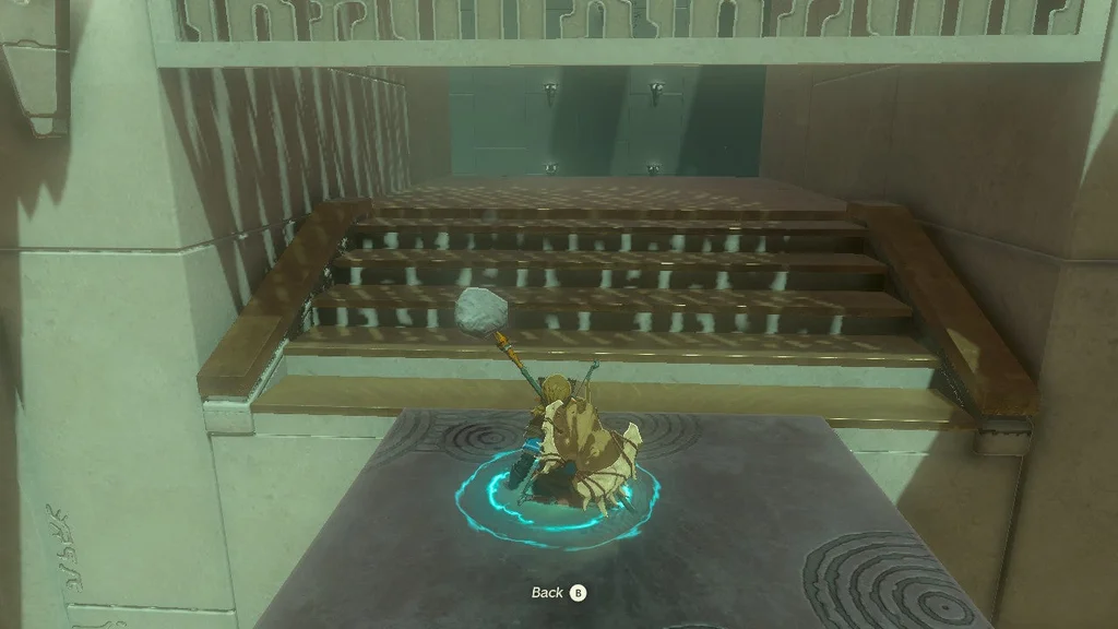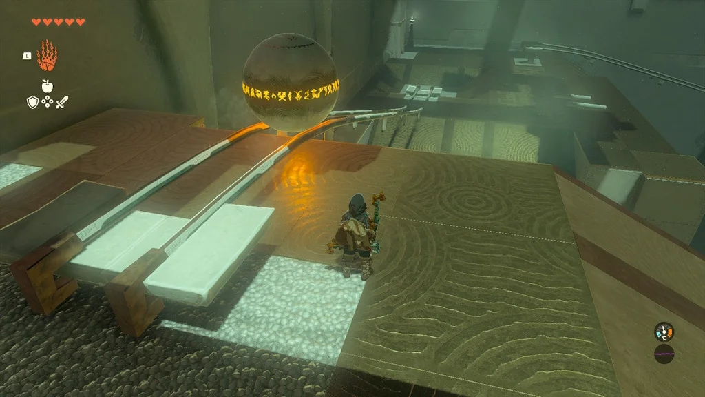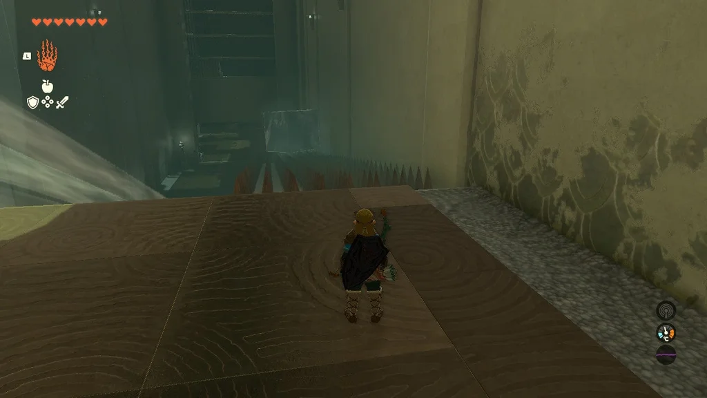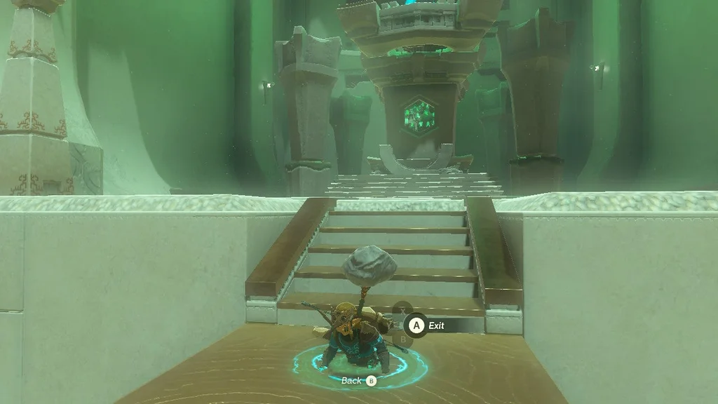Ліворуч від платформи знаходиться скриня зі скарбами святині, вбудована в стіну з рухомим блоком ліворуч від неї. Використовуйте Ultrahand, щоб покласти блок перед скринею зі скарбами.