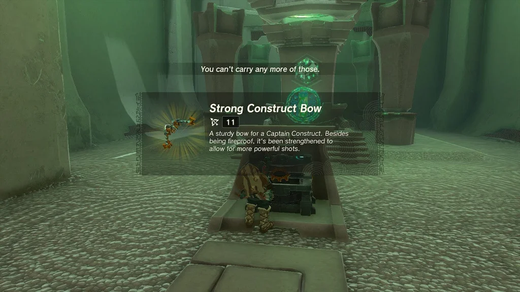 Скриня зі скарбами знаходиться в кутку третьої сферічної площадки, до неї веде драбина над розбитими коліями.l Існує багато способів дістатися до цього скарбу, але найшвидшим є використання чотирьох кам’яних панелей як імпровізованого мосту. З'єднайте їх впритул, а потім покладіть міст на розбиті доріжки. Це дозволить вам дістатися до Construct Bow у скрині.