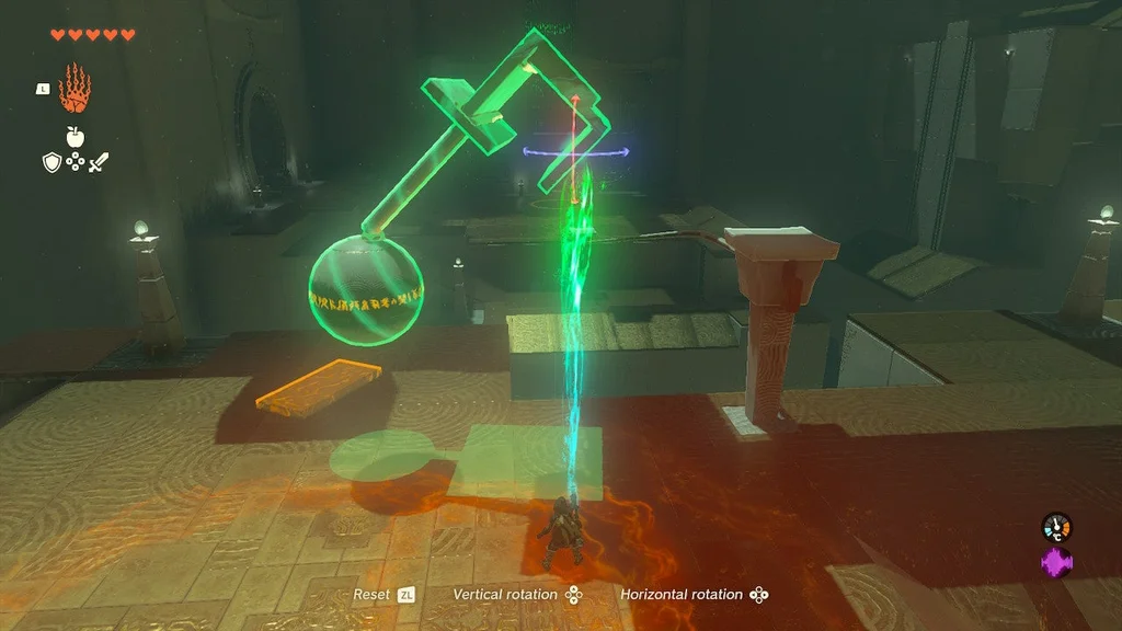 У лівому куті кімнати ви побачите кнопку, яку потрібно натиснути, щоб відкрити великі ворота поруч. Використовуйте Ультраруку, щоб схопити великий льодовий блок і ненадовго занурити його в стовпи полум’я з іншого боку кімнати, щоб розтопити його так, щоб він став достатньо малим, щоб поміститися в нішу кнопки. Покладіть блок льоду на кнопку, щоб відкрити ворота.