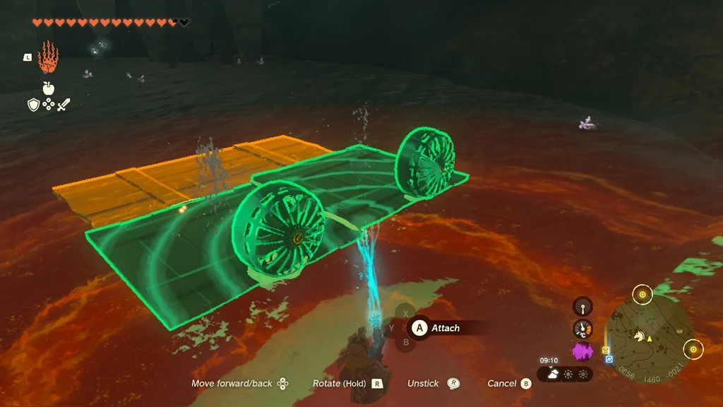 Потім скористайтеся ультраруким, щоб схопити металевий куб праворуч від наступної платформи. Використовуйте Ultrahand, щоб перетягнути його на лівий бік платформи, щоб Link міг опуститися на нього. Але поки що не піднімайтеся.