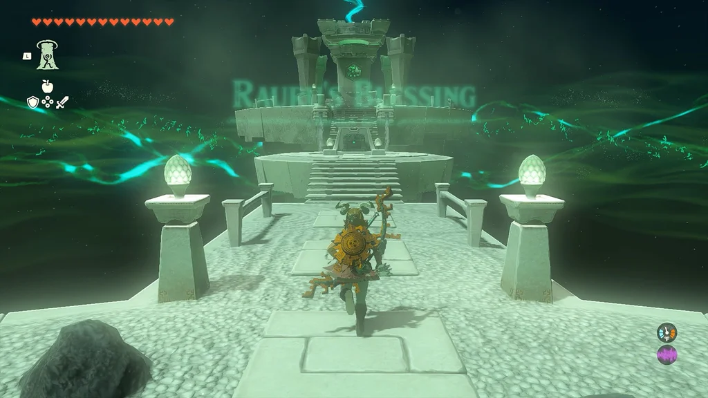 Після того, як злитий спис Zonai дістанеться через кільце, святилище Utojis активується ліворуч від вас. Оскільки це святилище благословення Рауру, все, що вам потрібно зробити, це зібрати скарб (великий заряд зони) і отримати світло благословення.