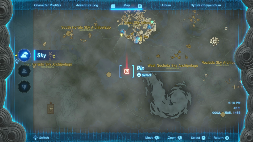 Поверніться на землю, відкрийте свою карту та клацніть до шару Небесний острів, щоб ви могли поставити туди штамп, щоб стежити. Тепер вам просто потрібно дістатися до цього Sky Island.