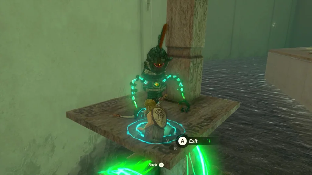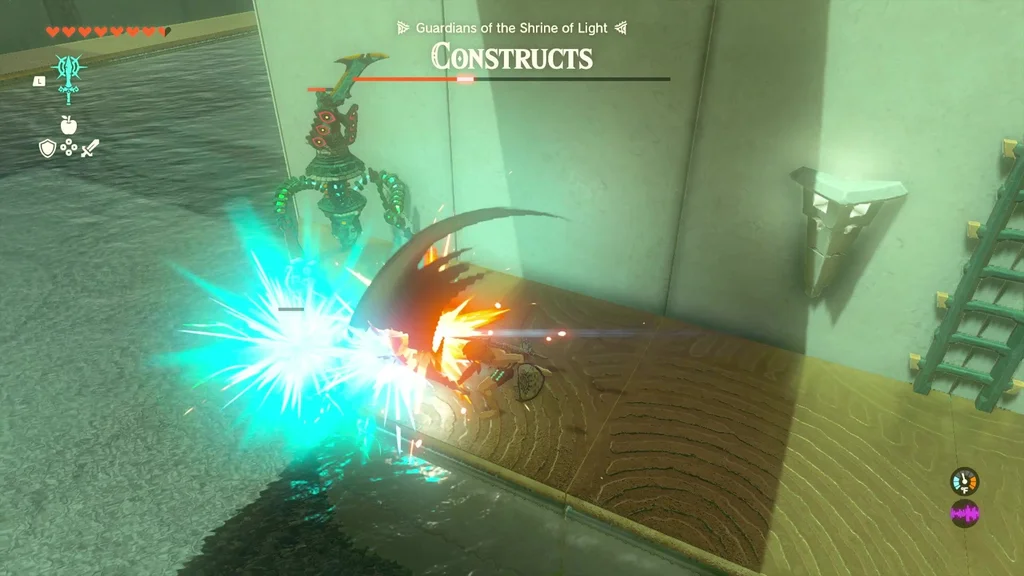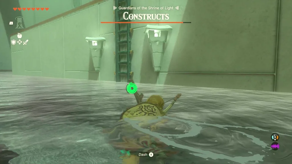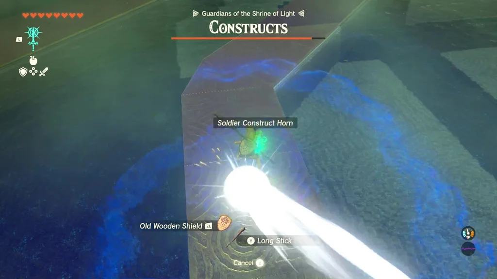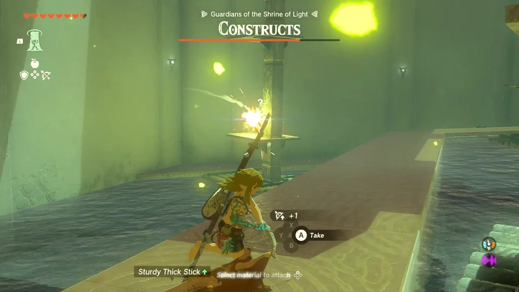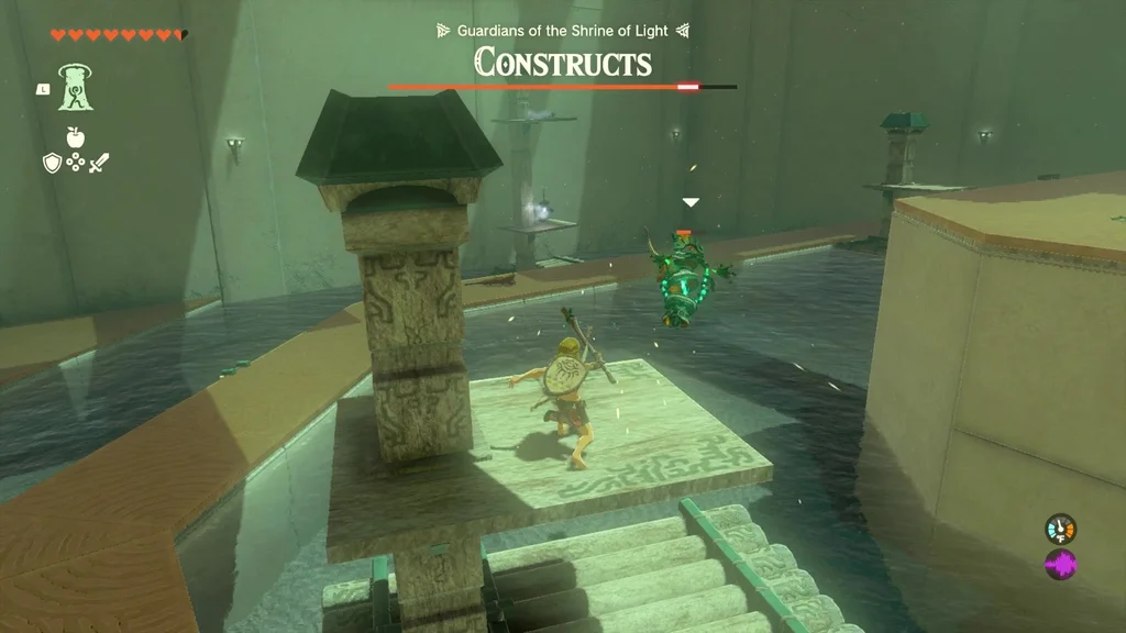 Храм затоплений водою, а кілька Конструктів плавають навколо на саморобних плотах. Ви можете заскочити на плоти, піднятися на їхні платформи та бити їх палицею. Конструкти викинуть старий дерев’яний лук, стріли, роги солдатського конструкту та шок-фрукти.
