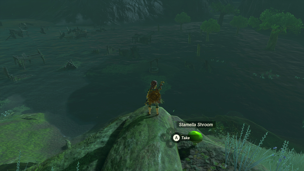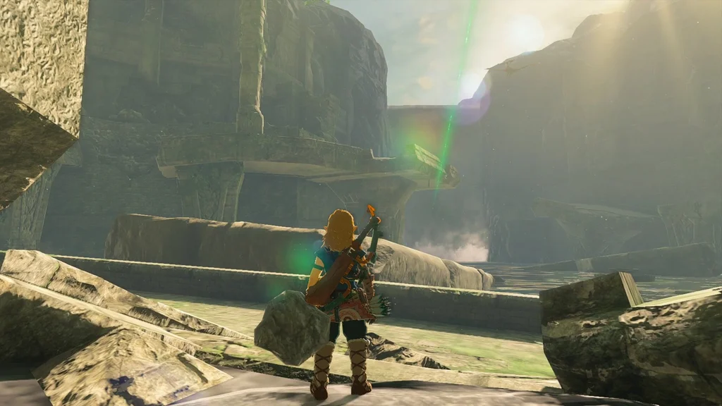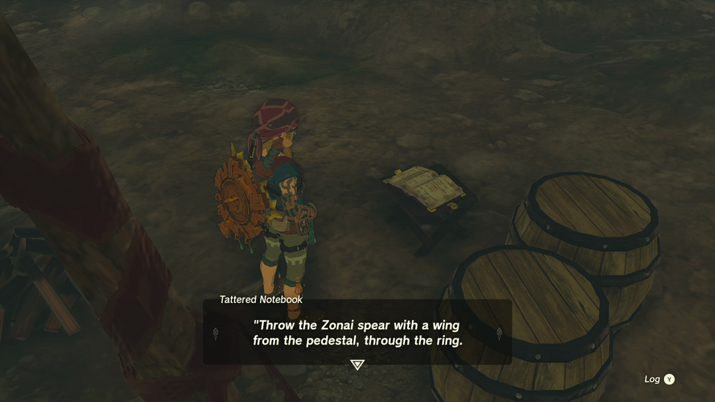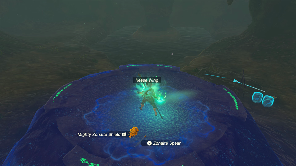 Візьміть один зі списів Zonaite, що лежить на землі, і підніміться на п’єдестал, який активується та починає світитися. Кільце на іншому кінці озера також буде світитися. Як сказано в книзі, вам доведеться з’єднати один зі списів Zonaite з крилом Keese.