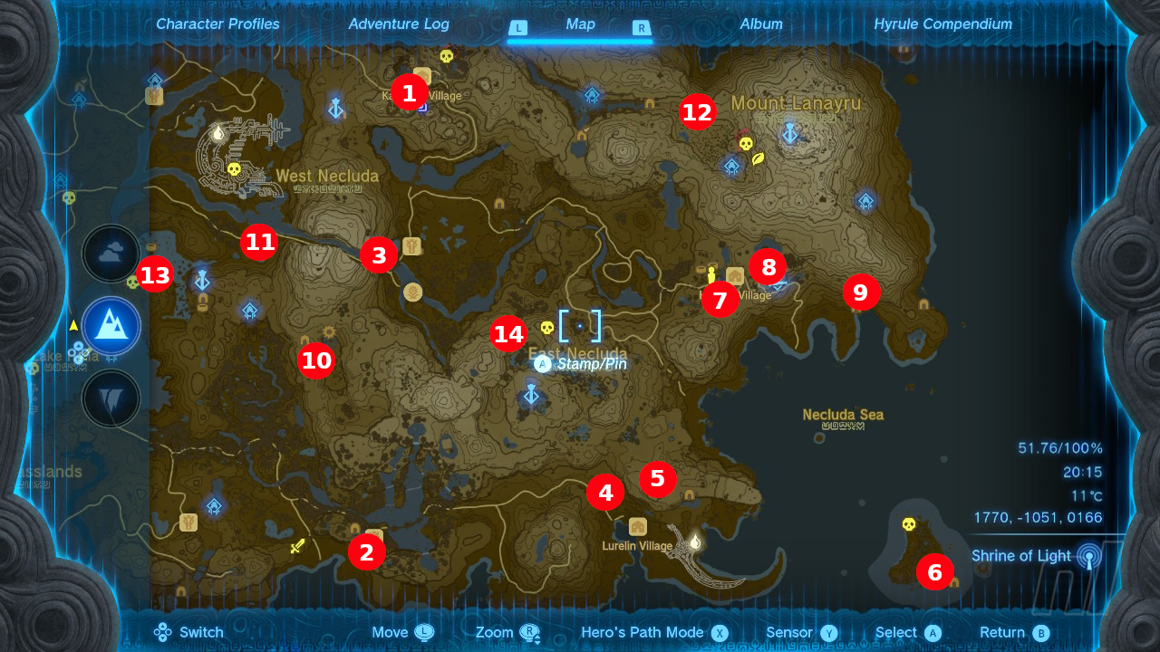 Розташування святині: на далекому сході Неклюди, на схід від стародавньої технічної лабораторії Хатено, є низка заток уздовж узбережжя Хатено. Спливіть зі скелі технічної лабораторії на схід, і ви потрапите до затоки Діпбек. Тут на піщаному пляжі можна знайти вхід до печери Deepback Bay, він веде в гори на північ. У печері Deepback Bay Cave є кілька потужних Horriblins, тому будьте обережні – ви можете влучити в них зі стелі стрілою і добивати їх, коли вони одужають. Печерну камеру, в якій зберігається храм Анедамімік, затопило, і вам потрібно буде осушити воду, щоб дістатися до неї. Шукайте отвір, що веде вниз на південний захід від святилища.