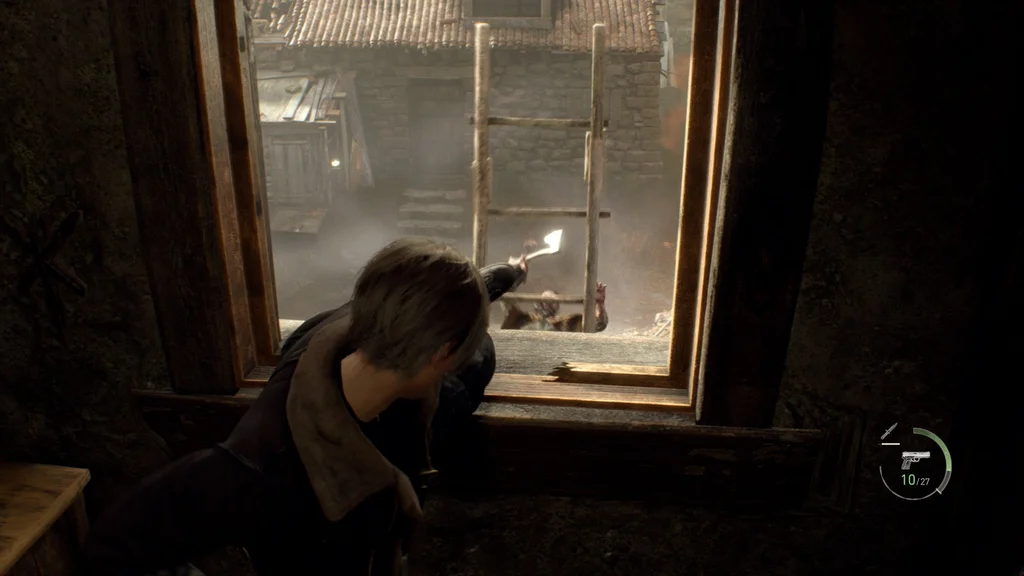 Ви захочете швидко рухатися сюди, оскільки жителі села почнуть товпитися внизу за допомогою жителя села з бензопилою (який зручно виламує двері), і вони почнуть встановлювати драбини, щоб лізти у вікна. Дійте швидко, щоб ударити ногою по драбині з протилежного боку кімнати, а потім поверніться, щоб вистрибнути з іншого вікна на дахи.